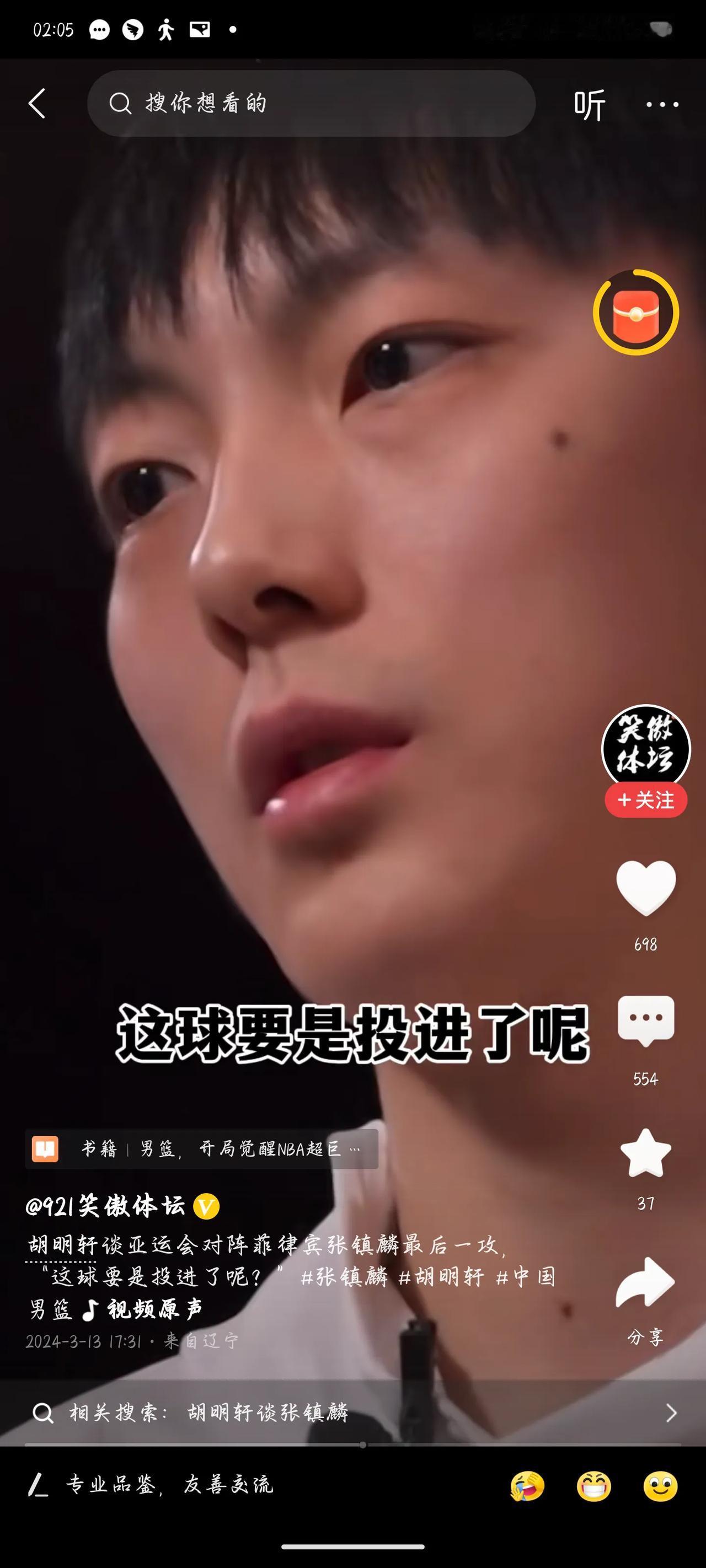 张镇麟对阵菲律宾的最后一投,胡明轩说的很对 这球要是进了呢? 没有人不想赢球。