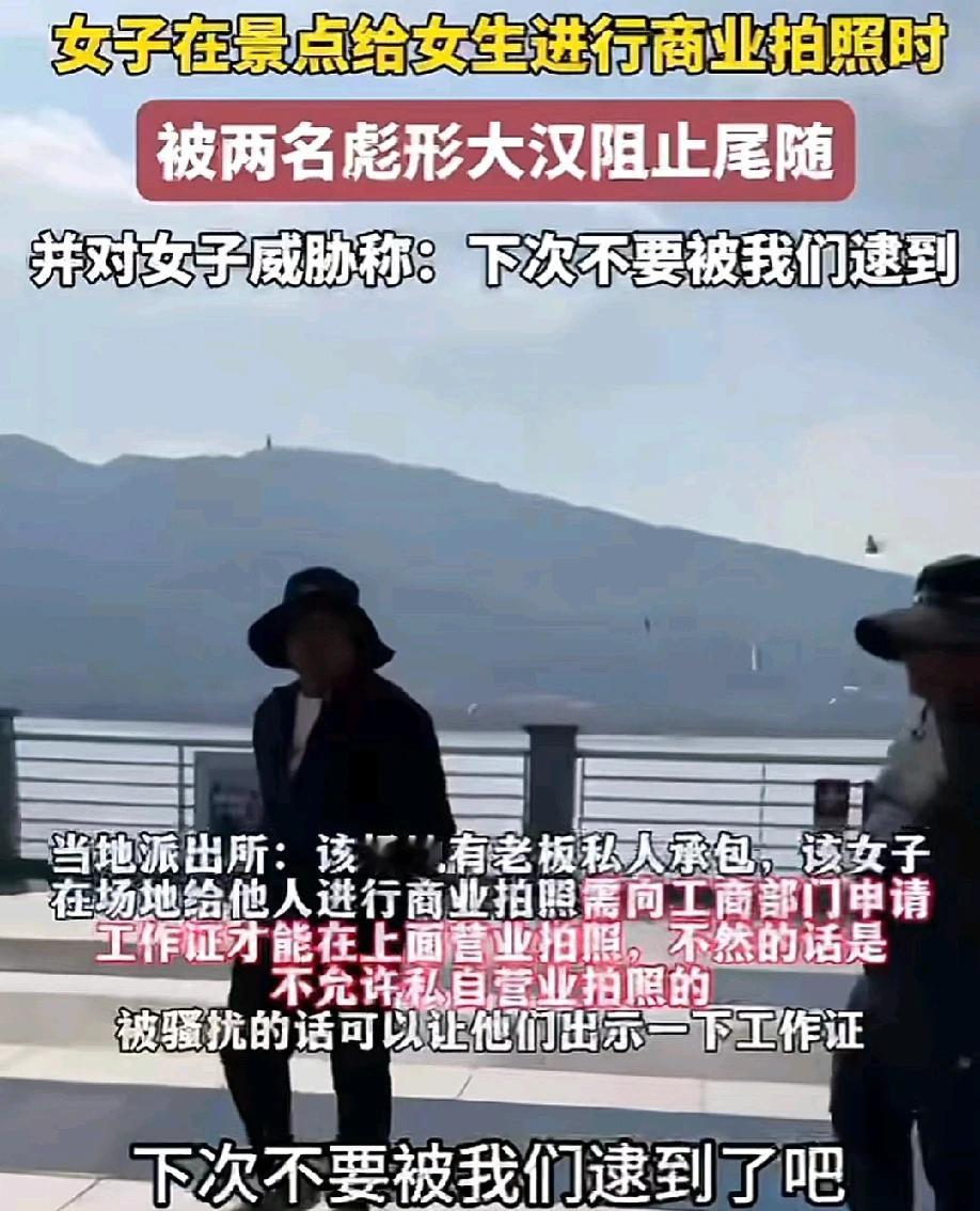 云南昆明,某旅游景点,一女子在帮几名女生商业拍照,不料却遭到了两名彪形大汉的尾随跟踪。女子很生气,问这个地方是他们的吗?彪形大汉说,是的。而且彪形大汉还威胁的说,下次不要让他们再次逮到。当地派出所说,这是私人老板承包的,不允许商业拍照。