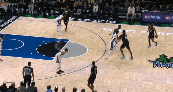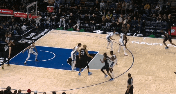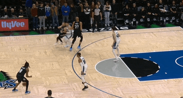 借助兰德尔的挡拆起手要到阿丘瓦换防,佯装单打阿丘瓦吸引防守注意力,实则迅速找到弱侧半空位的迪文。