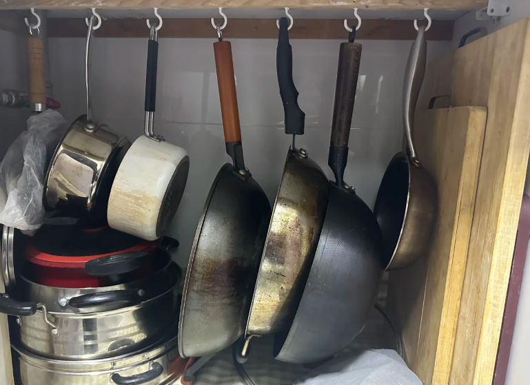 其实,如果你想要解决收纳问题很简单,将所有的锅具进行悬空收纳,拿取更顺手。