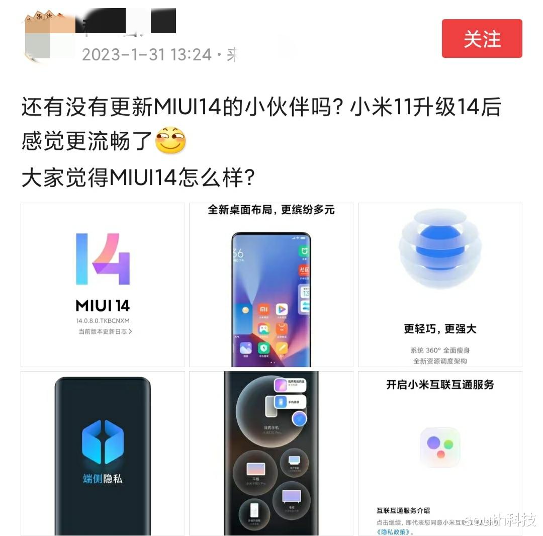 看他的表述,对于升级后的体验似乎挺满意的,他说小米11升级MIUI 14后感觉更流畅了,另外他还贴上了MIUI 14升级过程中的介绍图。不过他这个应该是内测稳定版,而不是正式版本,虽然官方近日已经公布了MIUI 14第二批升级名单,小米11全系都有,但是预计要3月底才能陆续完成推送。