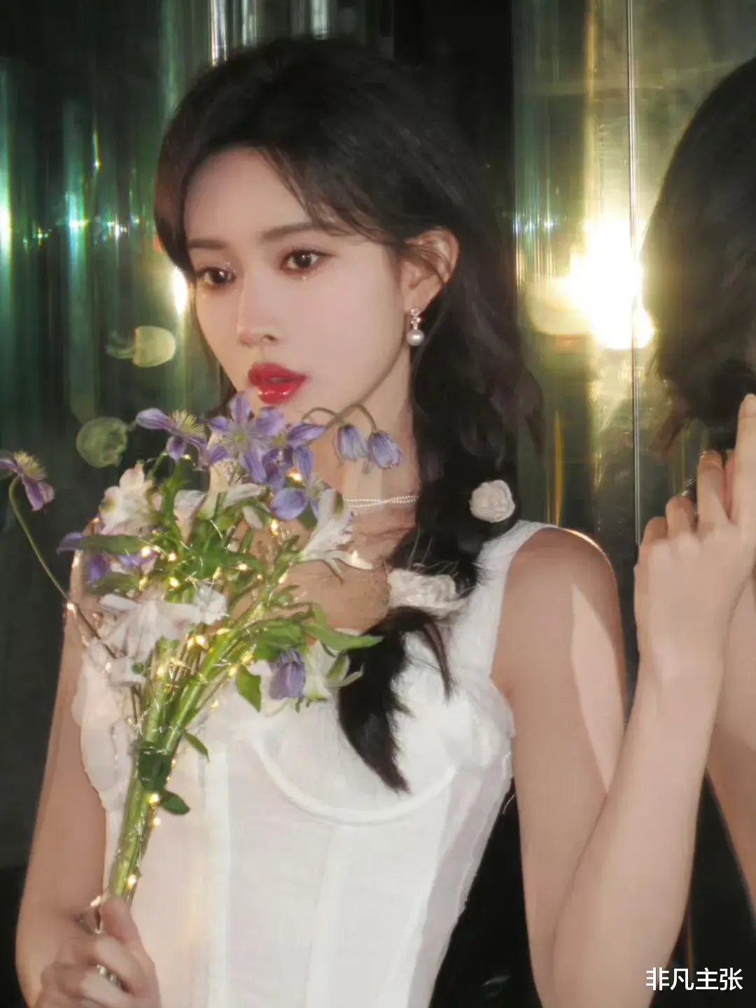 吊带的设计,巧妙地展现了孟子义优美的肩颈线和精致锁骨,为整个造型增添几分独特的性感与妩媚,立体修身的剪裁,很好地贴合她的身材曲线,在不经意的举手投足间,将女性的优雅、性感、清新体现得淋漓尽致。