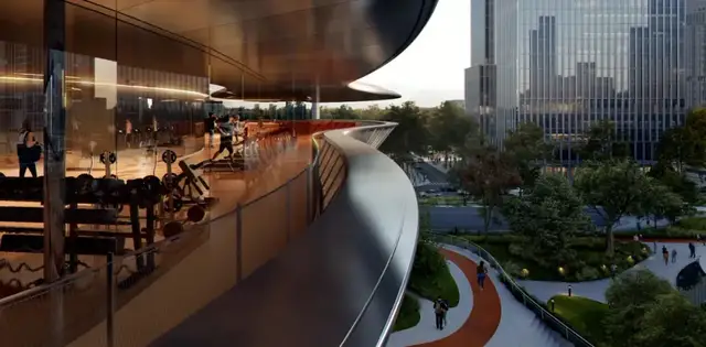 项目需解决5,200立方米冷却塔占地问题,设计将其抬升至二层,环绕布置空中活动层;屋顶向公园延伸并覆绿,形成立体绿洲,与环形跑道、缓坡绿地共同构建多层次公共空间。