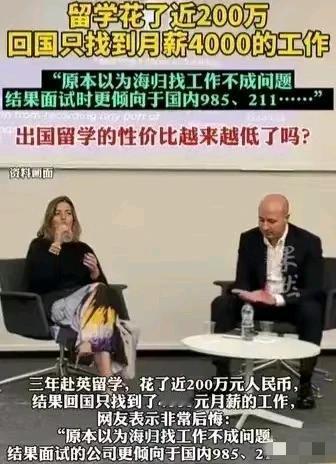 上海,一名从英国留学归来的男子,竟然找不到好的工作,只能找到一份月薪4000元的工作。男子很失落,因为他在英国留学就花了200万人民币。这样算下来,要不吃不喝40年才能回本。男子感叹道:英国海归竟然不值钱了,真是世道变了,连国内的985大学和211大学毕业生都比自己挣得多!