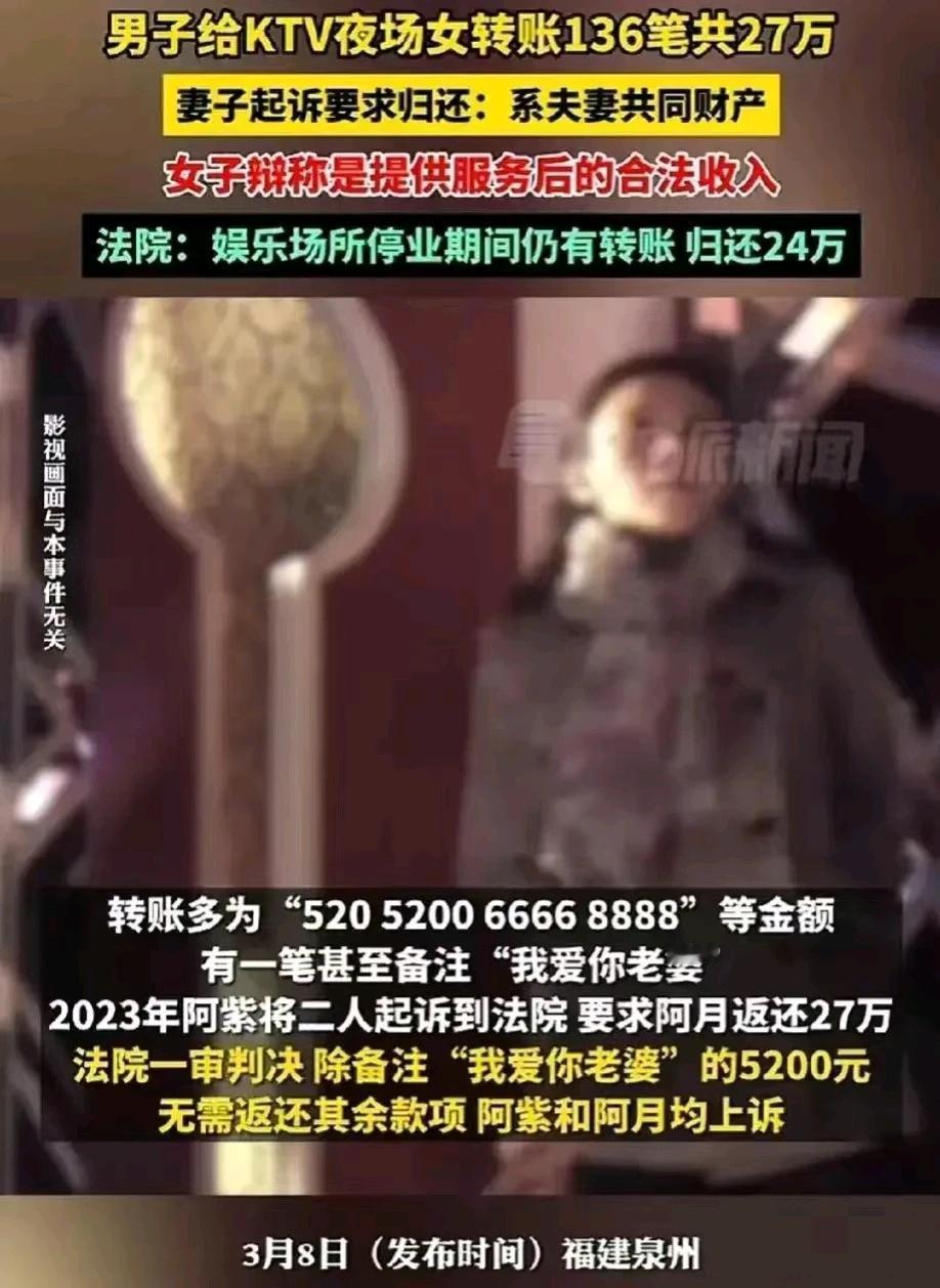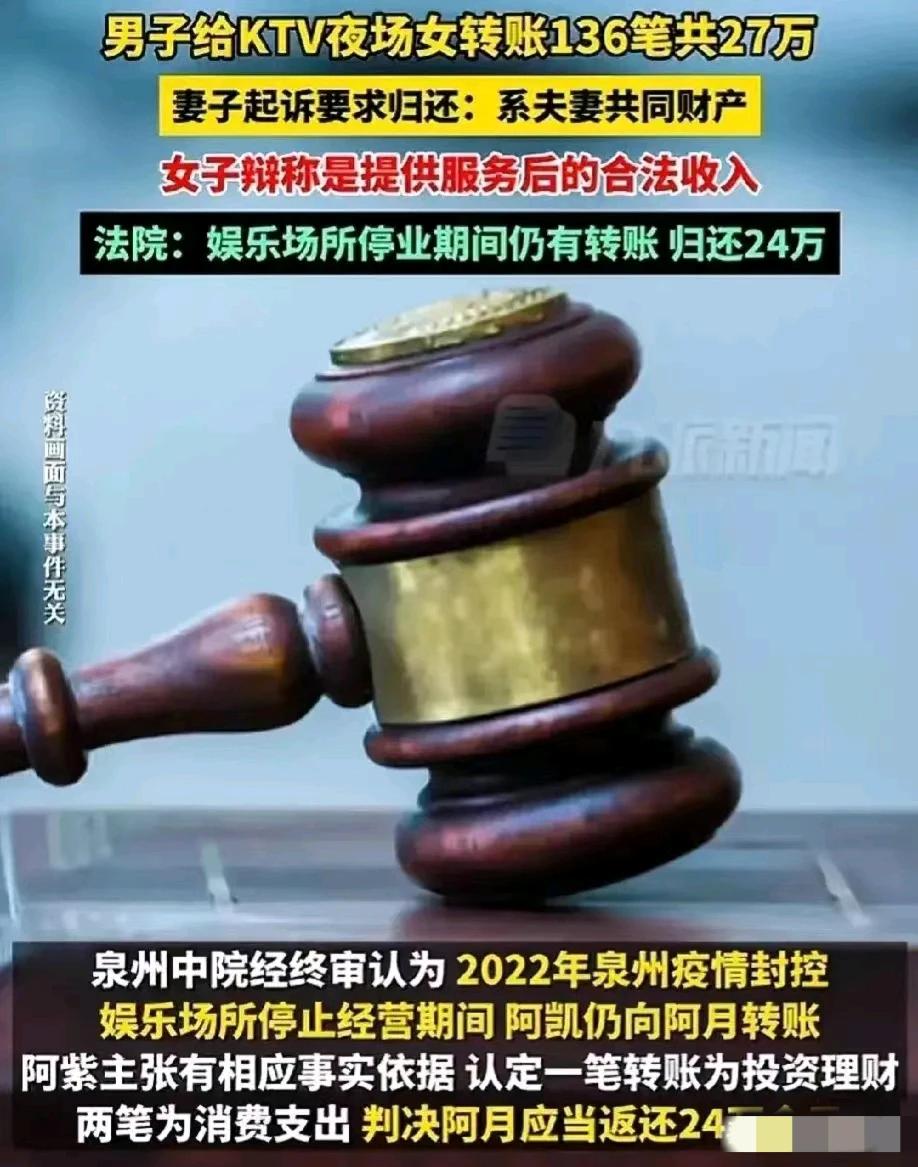 “白嫖了!”福建泉州,一女子发现丈夫出轨了,丈夫与某KTV夜场的女子有不正当的关系。更可恶的是,丈夫在3年的时间内,竟然给KTV女子转了136次账,金额高达27万余元。女子怒不可遏,一纸诉状,将KTV夜场女子起诉到法院,要求夜场女子归还27万余元的夫妻共同财产。但夜场女子在法庭上却辩称,说是提供服务后的合法收入。最后法院这样判了!