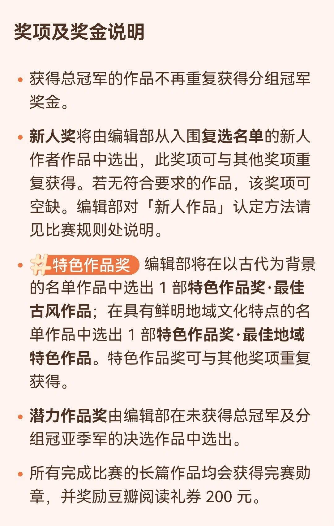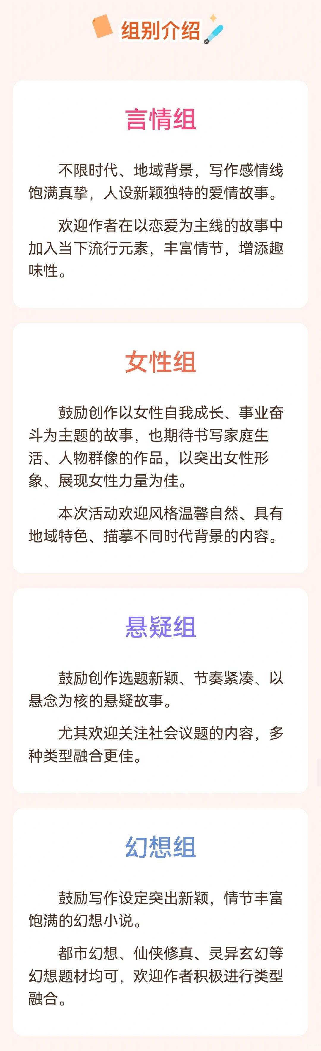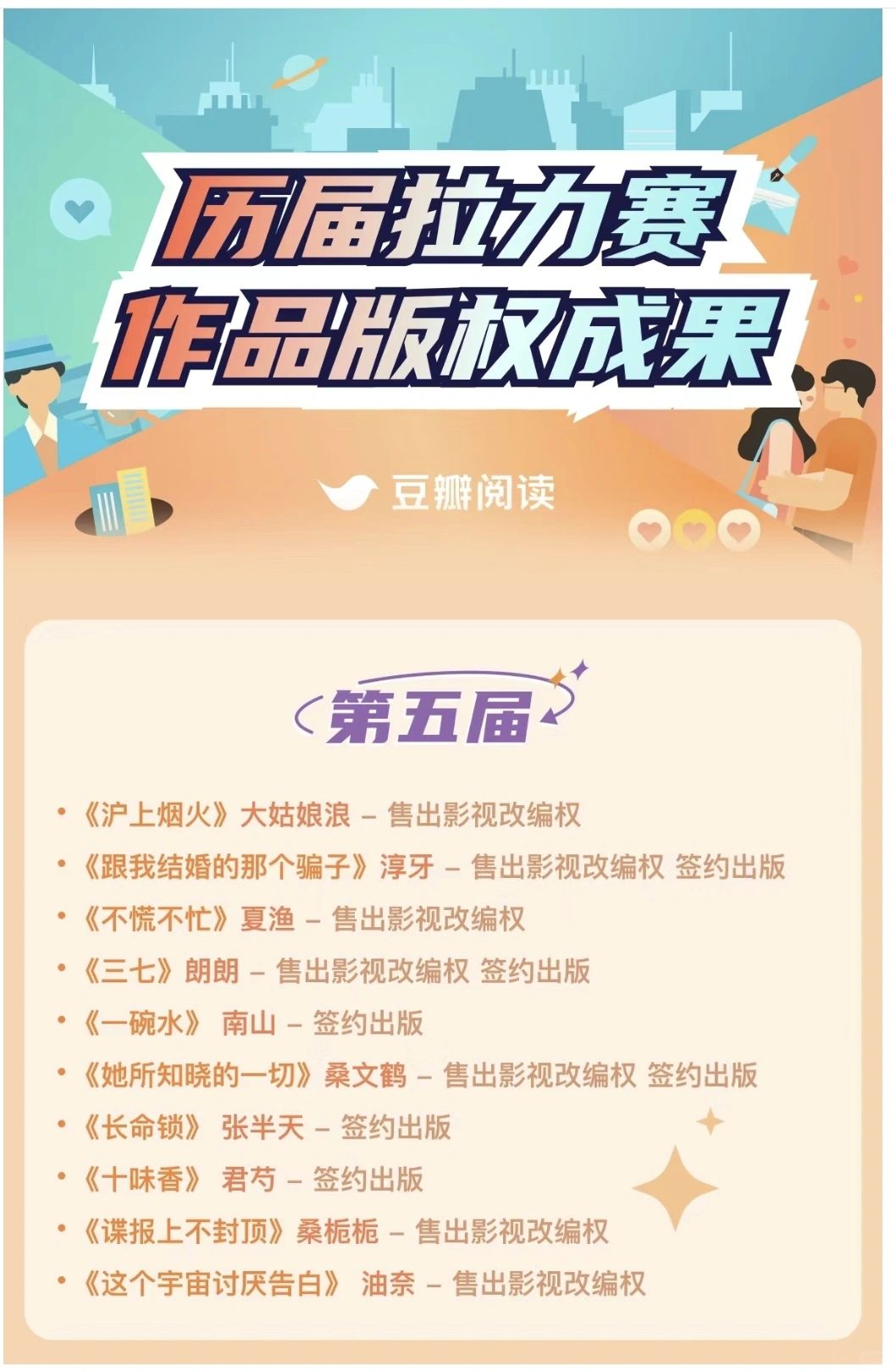 ✅比赛分言情、女性、悬疑、幻想四大组别。 ✅字数要求是 10 万字-70 万字之间的长篇小说。 ✅获奖作品最高可赢取 10 万元奖金。 ✅版权关注阵容豪华,影视观察团集齐了爱奇艺、优酷、腾讯、芒果四大平台! [种草R]P6—P10是『豆瓣阅读』历届长篇拉力赛的版权成果[拔草R] 欢迎各位作者大大们踊跃报名参加![鼓掌R][鼓掌R][鼓掌R]