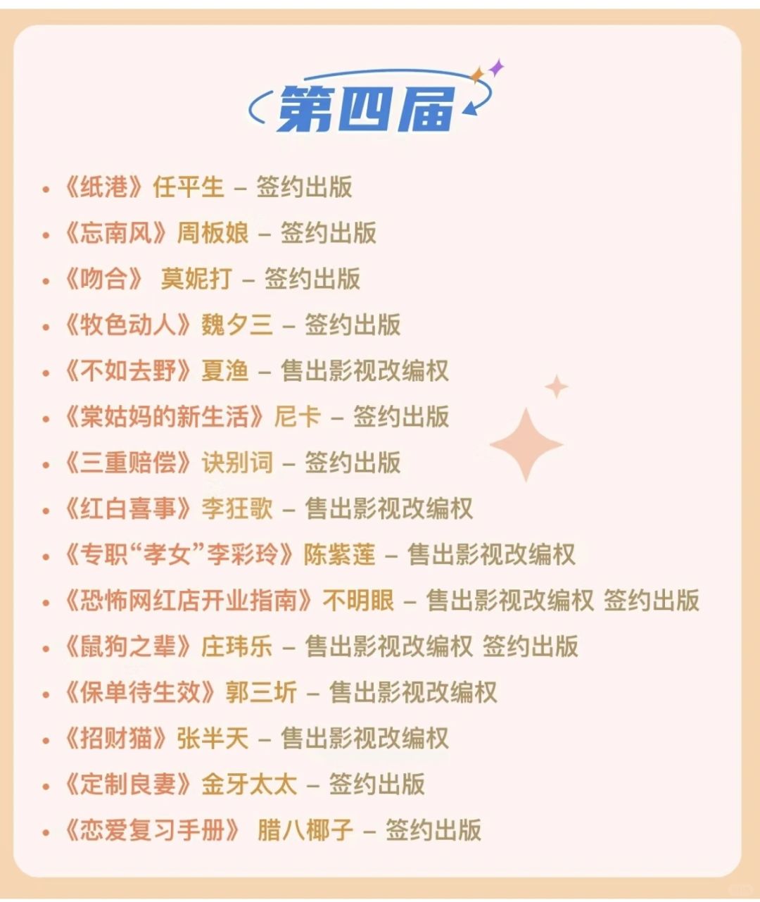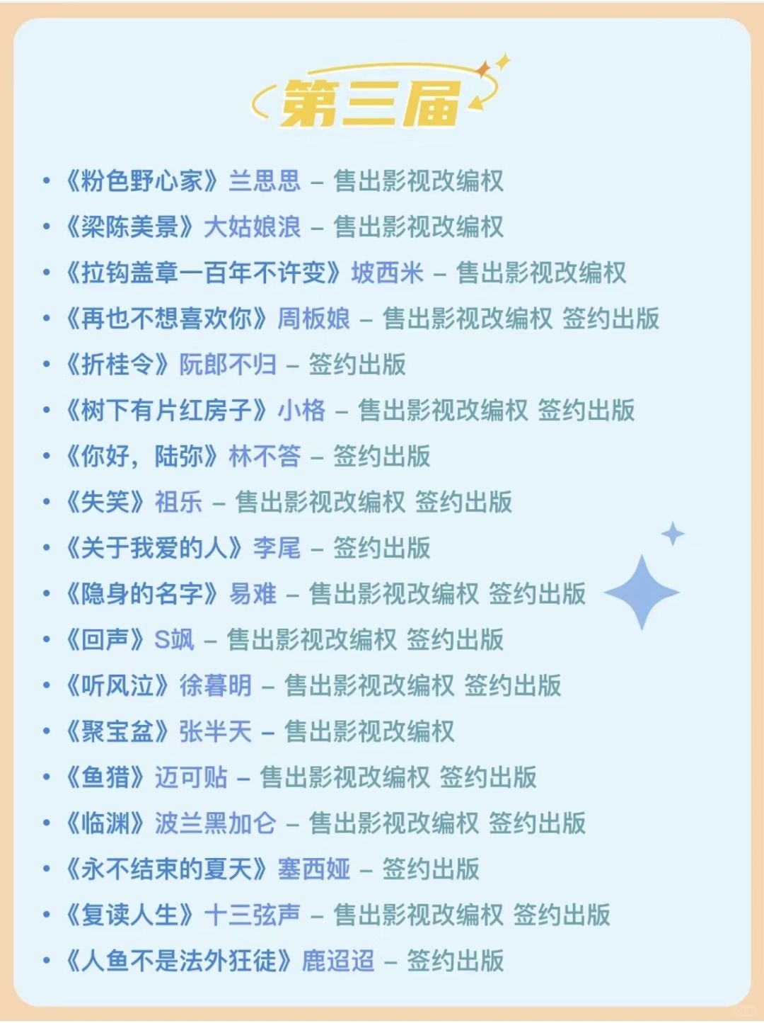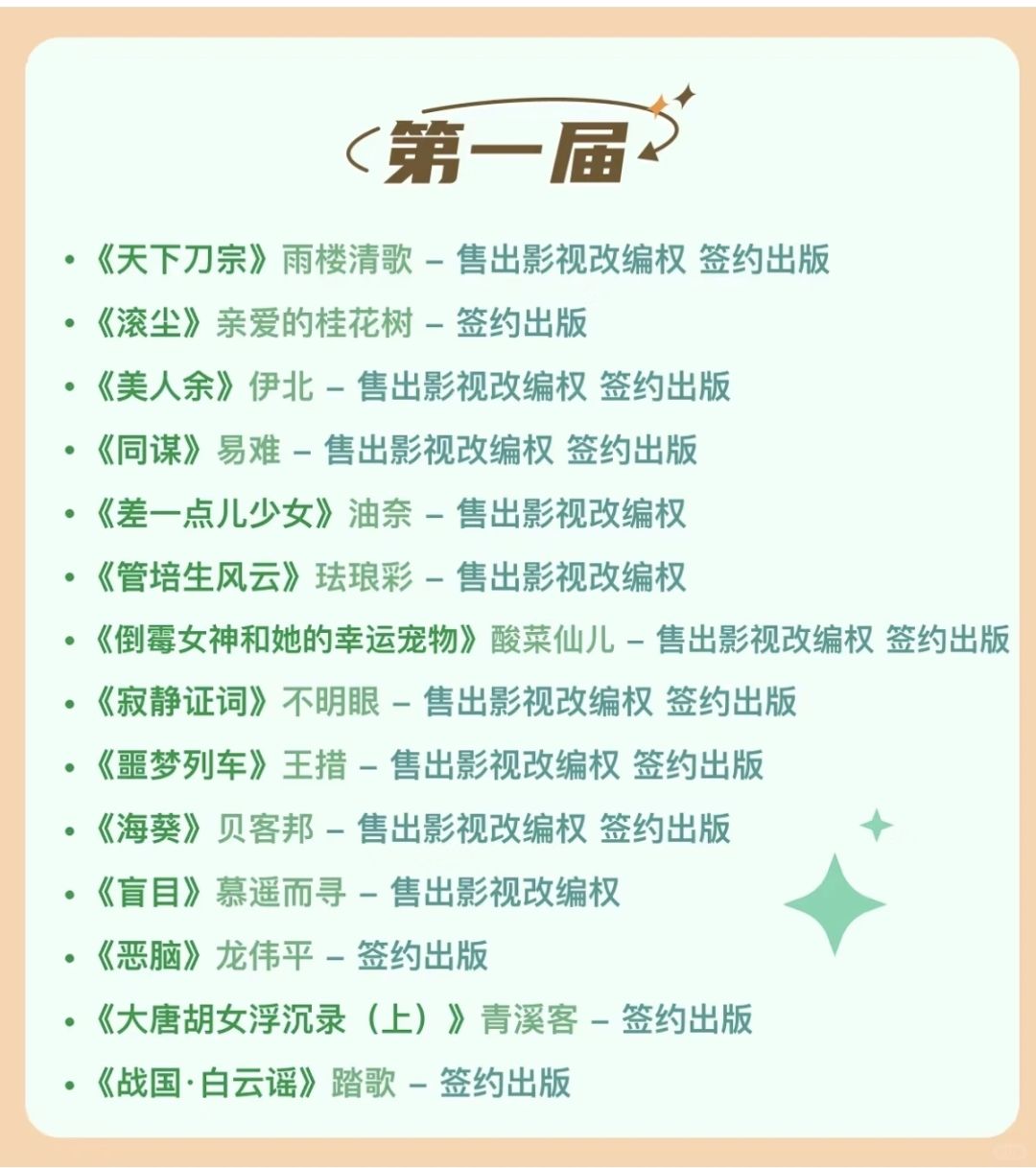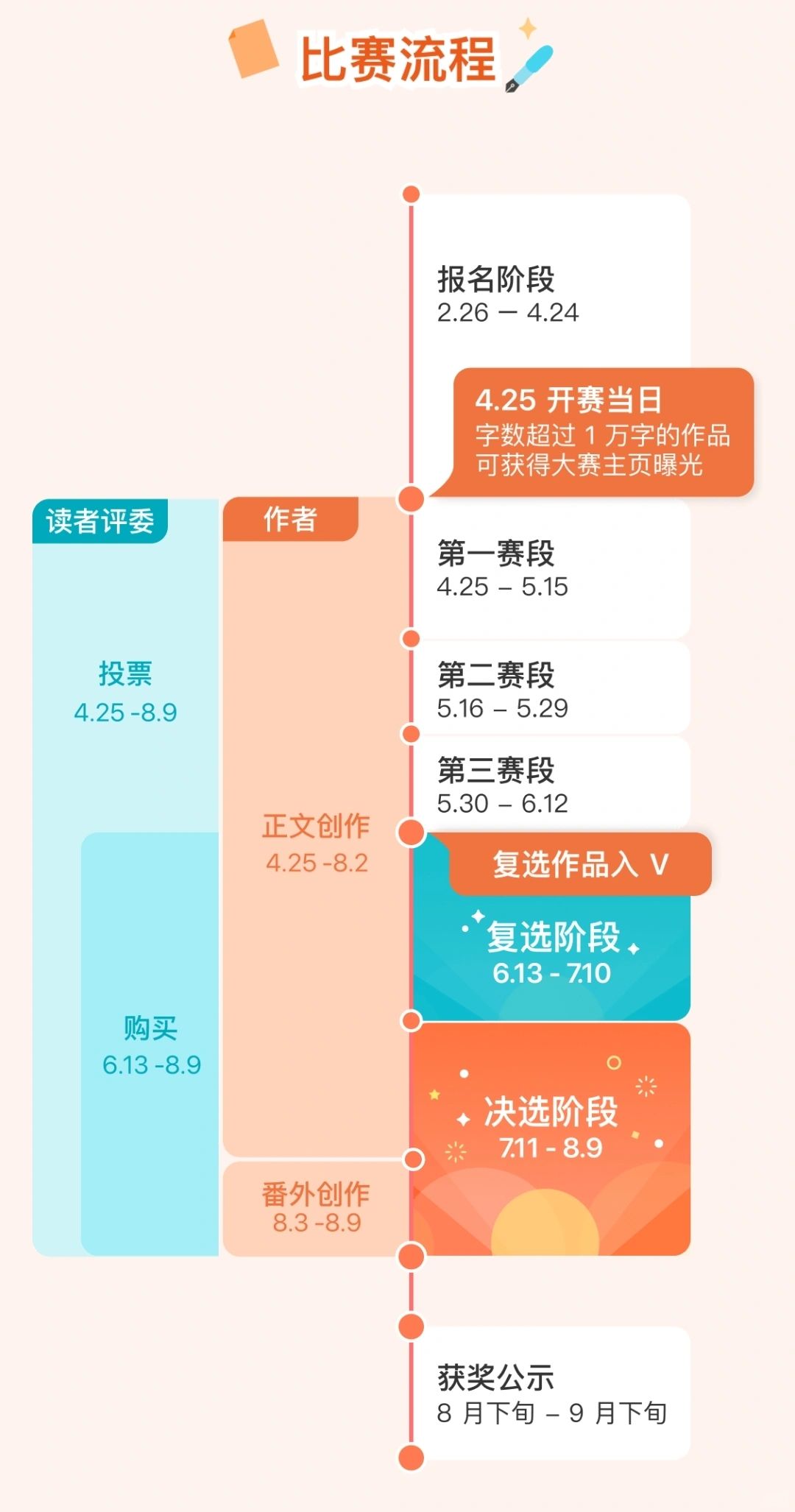 ✅比赛分言情、女性、悬疑、幻想四大组别。 ✅字数要求是 10 万字-70 万字之间的长篇小说。 ✅获奖作品最高可赢取 10 万元奖金。 ✅版权关注阵容豪华,影视观察团集齐了爱奇艺、优酷、腾讯、芒果四大平台! [种草R]P6—P10是『豆瓣阅读』历届长篇拉力赛的版权成果[拔草R] 欢迎各位作者大大们踊跃报名参加![鼓掌R][鼓掌R][鼓掌R]