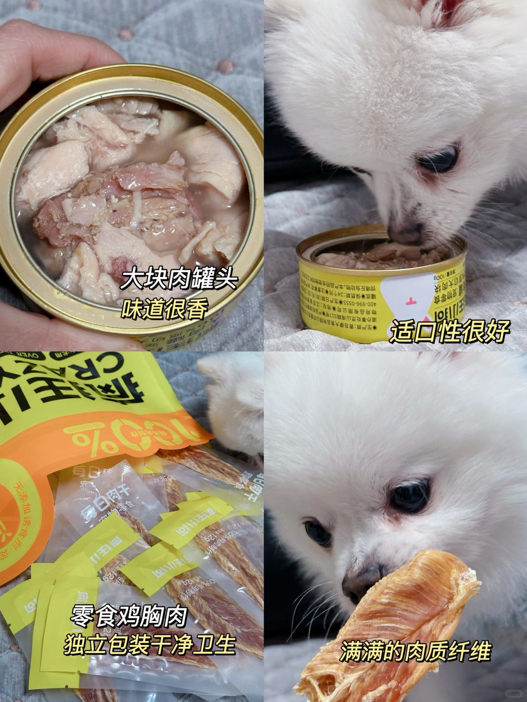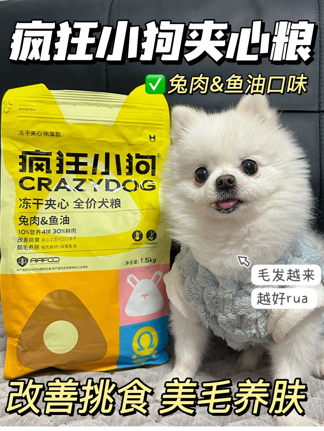🌟狗粮是兔肉夹心的,确实很香,有肉松味,我也替狗子尝了几颗(不是 兔肉富含卵磷脂和烟酸,还有鱼油提供omega-3,这些都对毛孩子的皮肤生长有帮助,我家现在不仅毛毛有光泽,皮屑什么的也几乎没有,而且很少长皮肤B了。