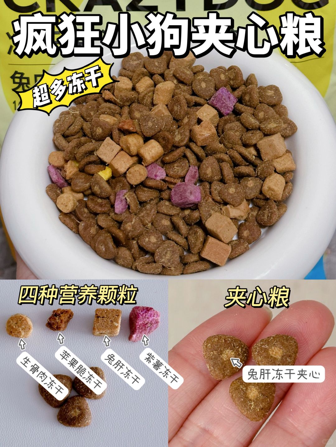 🌟有四种营养颗粒,兔肝+生骨肉+紫薯+苹果粒,荤素搭配 ,真的不用再额外添加辅食,很省心!