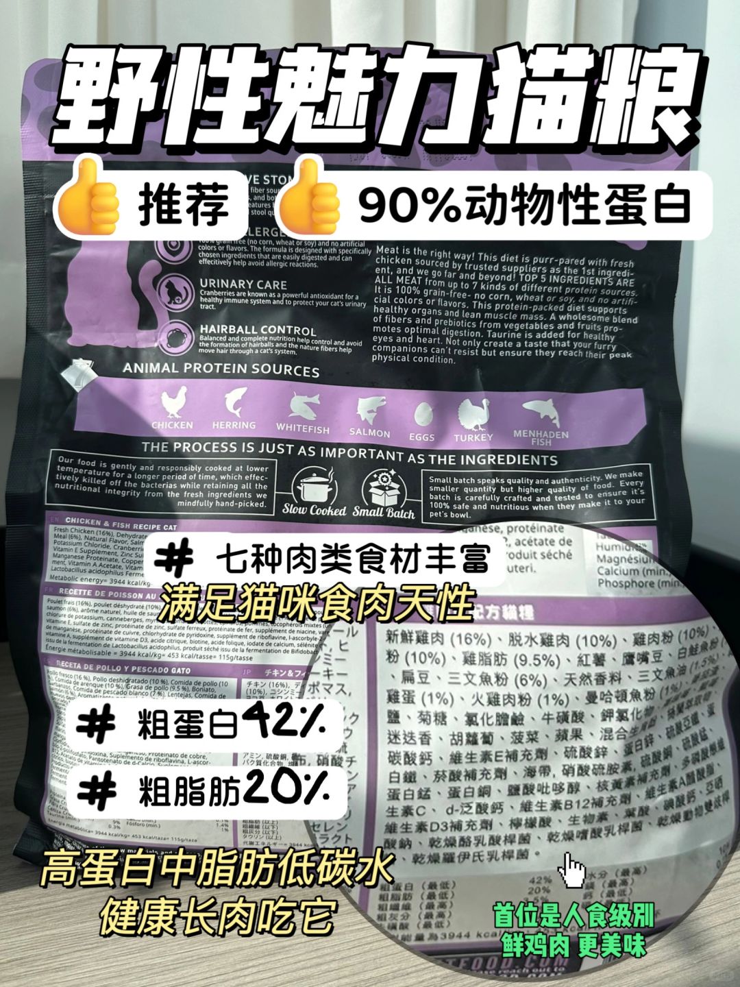 这里安利一下我家猫咪吃的美国进口猫粮👉野性魅力猫粮,它的含肉量超多,一共有4-7种肉肉,不仅味道好,营养也很全面,禽类和鱼类都有,长肉美毛双管齐下🆙,首位是人食用级别新鲜鸡肉,动物蛋白占比有90%,比植物蛋白更好消化吸收,而且低碳水配方,还不容易虚胖。