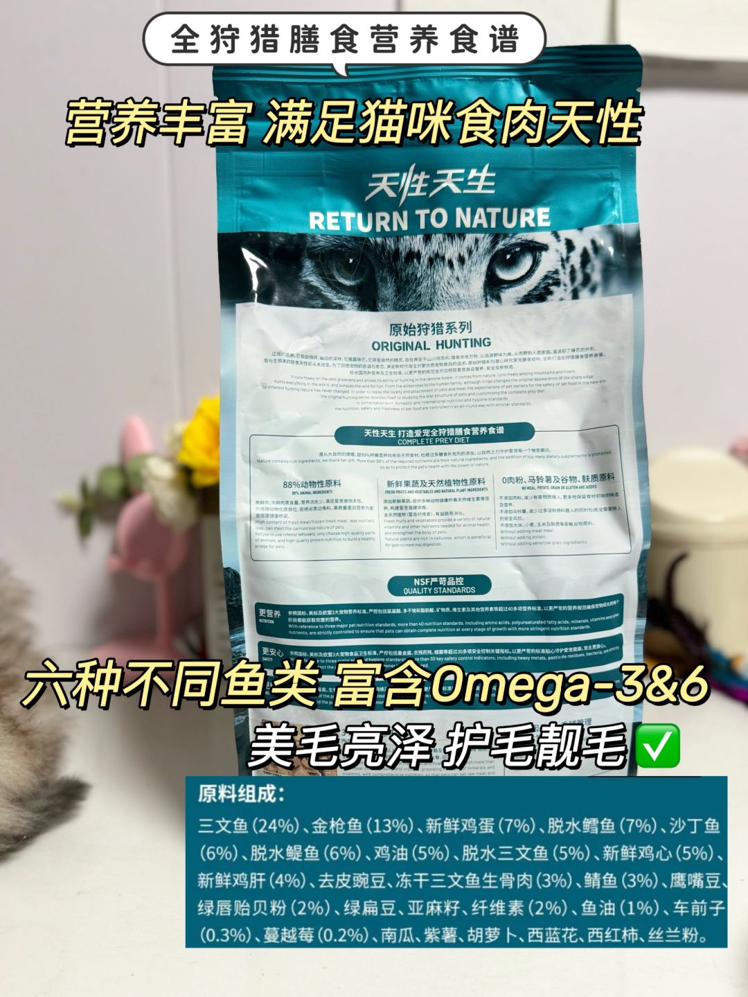 且选用六种不同鱼类 富含Omega-3&6,帮助猫咪美毛亮泽,减少掉毛!真的解决了我好多困扰~