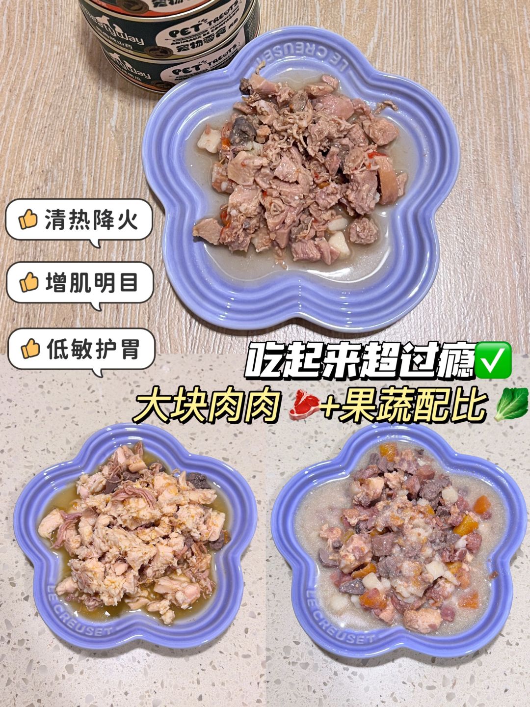 这款罐头选用的是优质鲜肉,一打开就可以看到满罐的大肉块搭配蔬菜,营养丰富!小狗可以偶尔当主粮,大狗狗的话可以拿罐头拌主粮,给狗子加加餐~他家的肉汁不多但浓厚,都是肉肉炖出来的原汤汁,有的不爱喝水的狗子 可以兑水骗水喝~