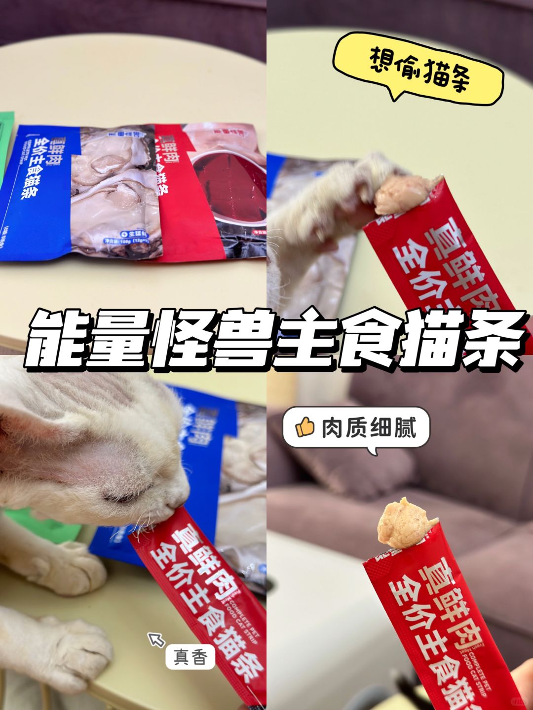 能量怪兽主食猫条,我家猫每次听见我拆这个猫条的声音就飞奔过来,这款是真鲜肉猫条,0谷0胶0淀没添加肉粉和人工诱食剂,能提高猫咪免疫力补锌美毛和能量营养