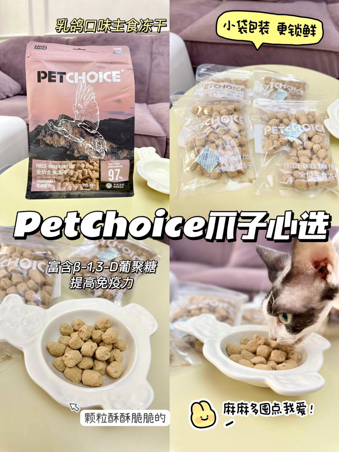 PetChoice爪子心选的全价生骨肉主食冻干,有海陆空几种口味 我比较喜欢乳鸽味的 乳鸽配方是免疫卫士,富含β-1,3-D葡聚糖,提高猫咪的免疫力。添加一整只乳鸽,冻干酥软一捏就碎,有一股肉香味。小袋分装不担心变质,每袋都有质检报告