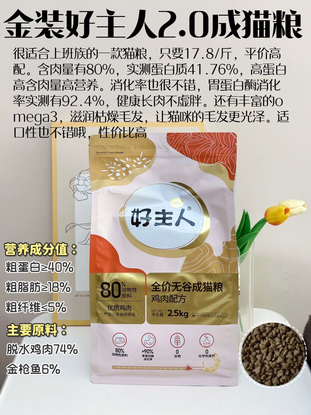 很适合上班族的一款猫粮,只要17.8/斤,平价高配。含肉量有80%,实测蛋白质41.76%,高蛋白高含肉量高营养。消化率也很不错,胃蛋白酶消化率实测有92.4%,健康长肉不虚胖。还有丰富的omega3,滋润枯燥毛发,让猫咪的毛发更光泽。适口性也不错哦,性价比高