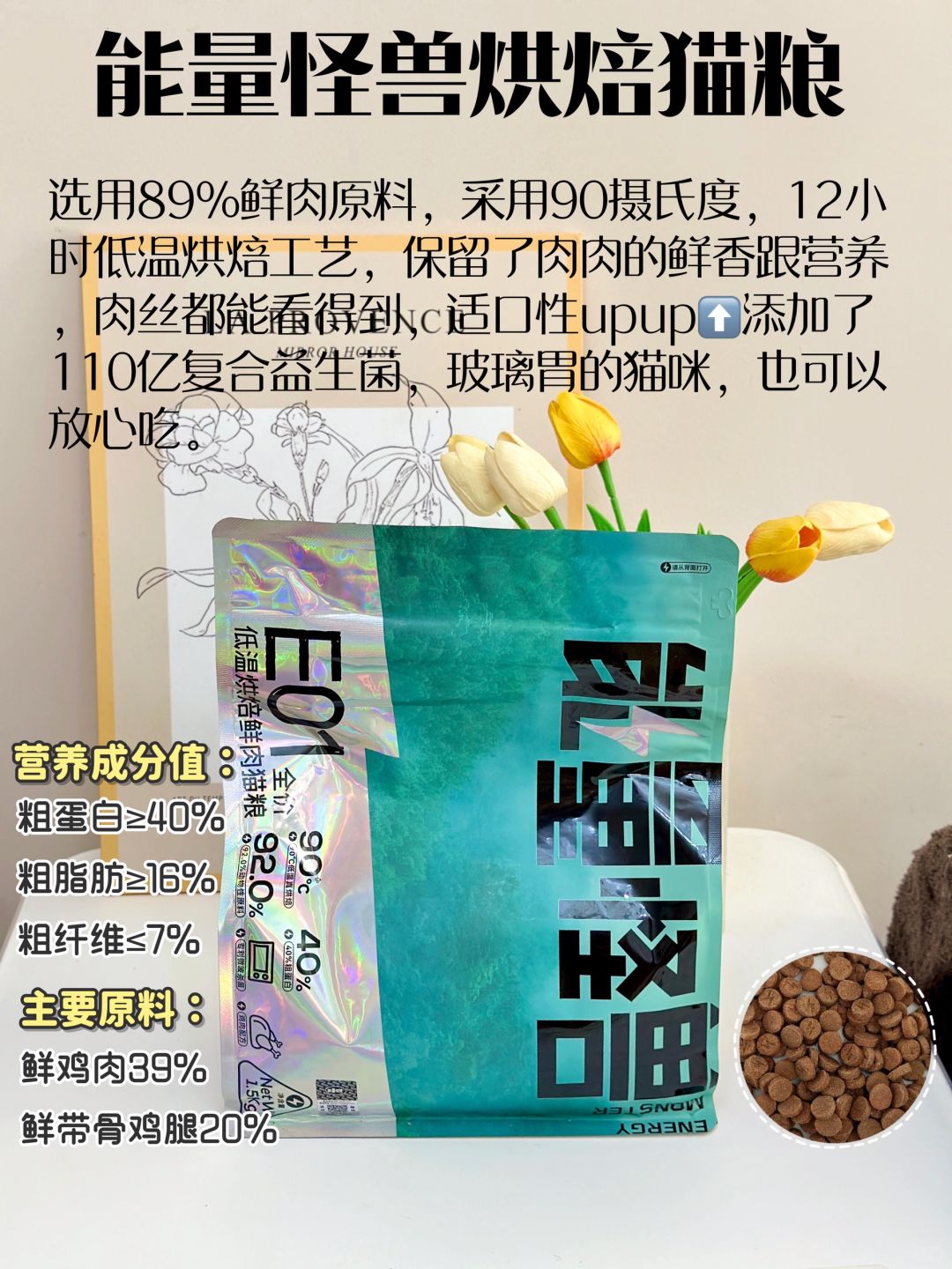 选用89%鲜肉原料,采用90摄氏度,12小时低温烘焙工艺,保留了肉肉的鲜香跟营养,肉丝都能看得到,适口性upup⬆️添加了110亿复合益生菌,玻璃胃的猫咪,也可以放心吃。