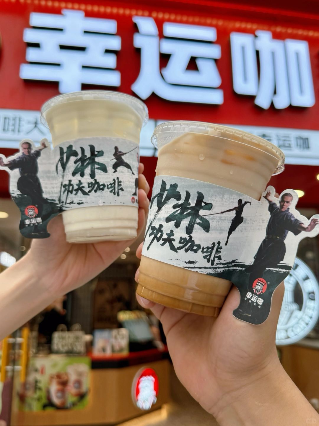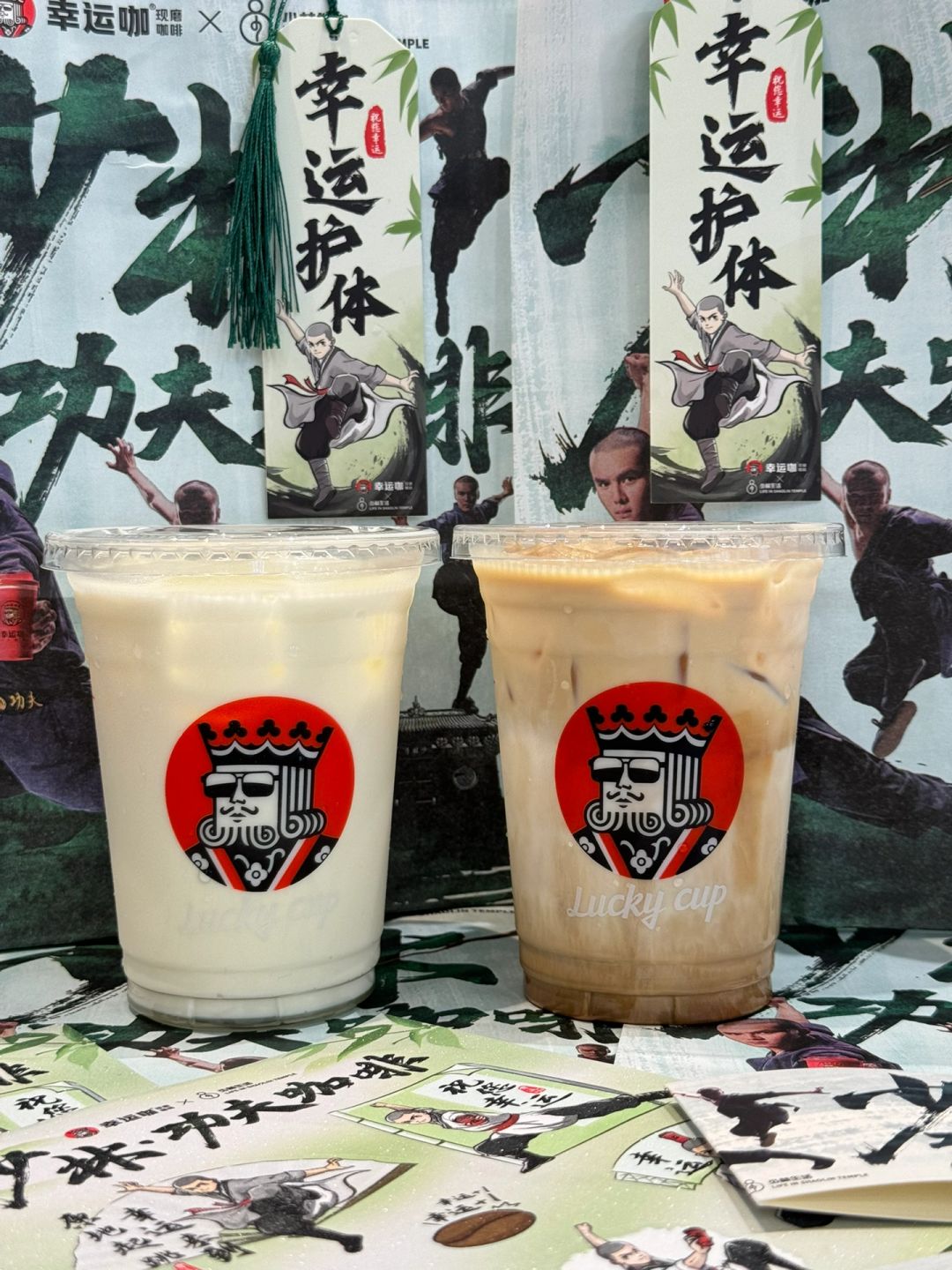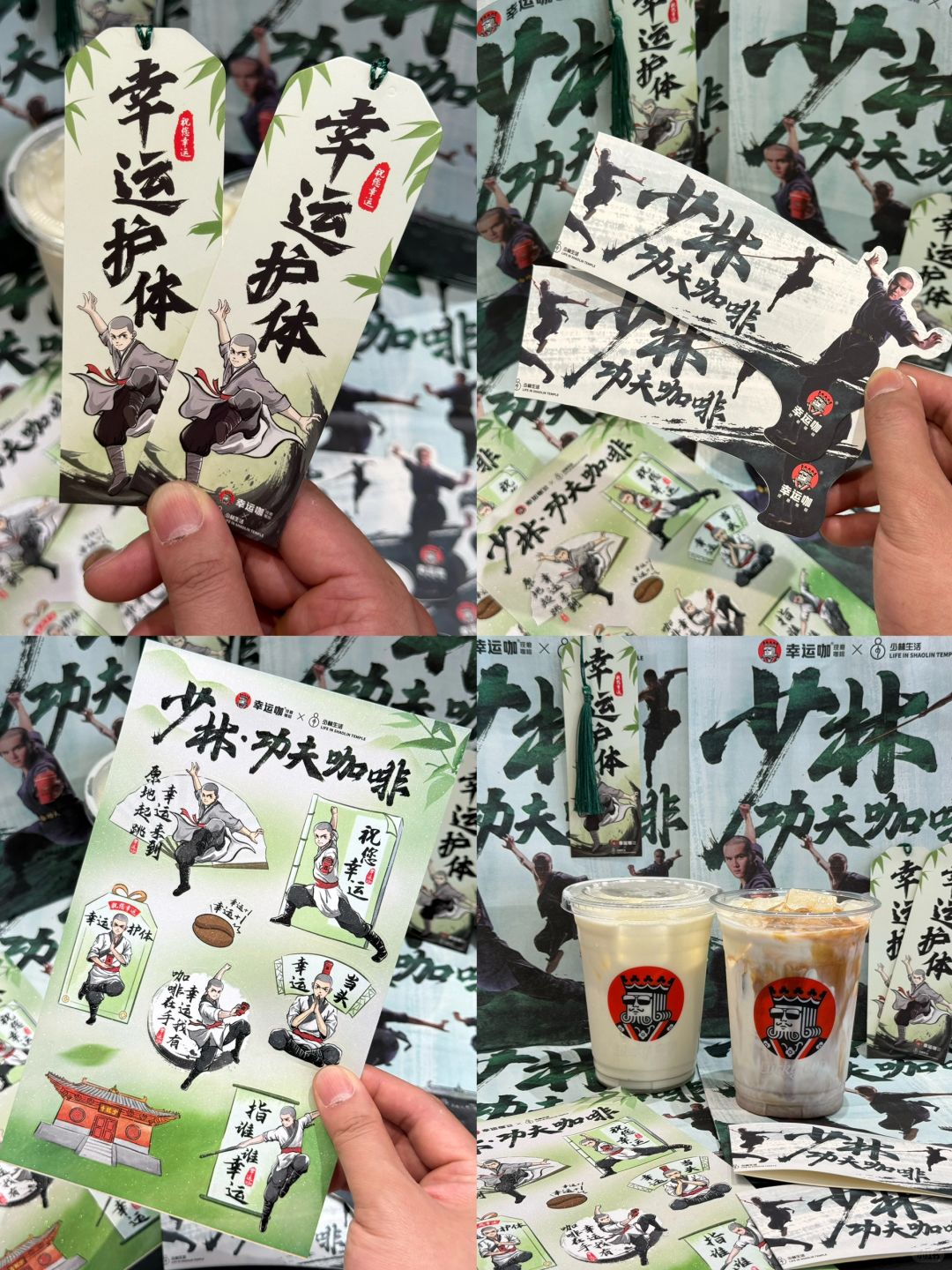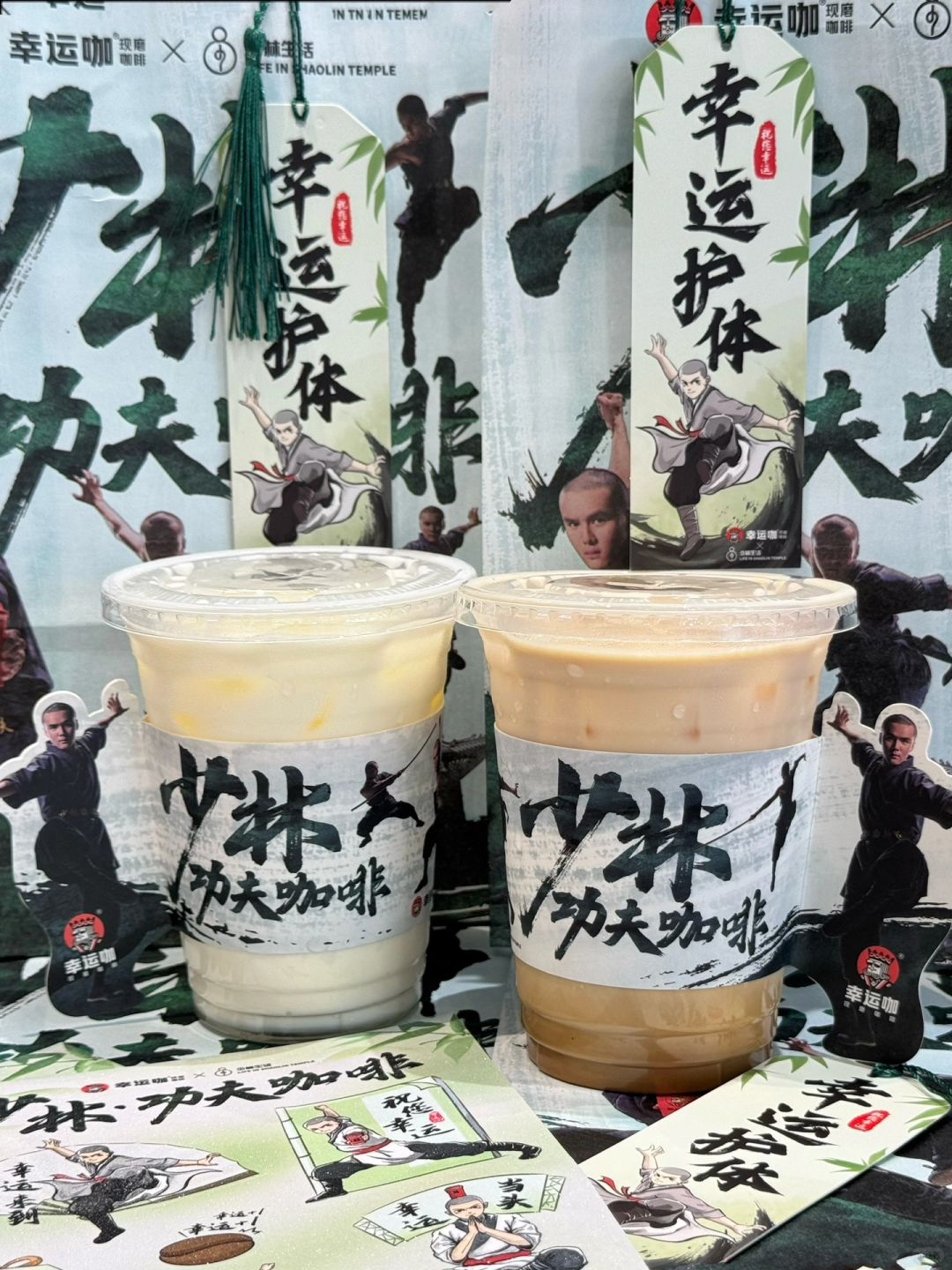 少林功夫龙井茶咖系列,以龙井茶汤为底,饮一口东方茶清香,牛乳与茶汤的清新融合,拿铁融合醇厚咖啡,茶与咖的碰撞浑然天成! 🍵功夫龙井轻乳茶:龙井茶汤+朝日维品牛乳,推荐半糖,龙井茶浓香无苦味! ☕️功夫龙井拿铁:IIAC金奖咖啡+朝日维品牛乳+龙井茶汤,清香茶味结合后清新的口感! 幸运咖✖️少林生活联动 ✅周边攻略:书签/贴纸/纸袋/杯套 1杯🉐贴纸➕杯套 2杯🉐贴纸➕杯套➕书签➕联动纸袋