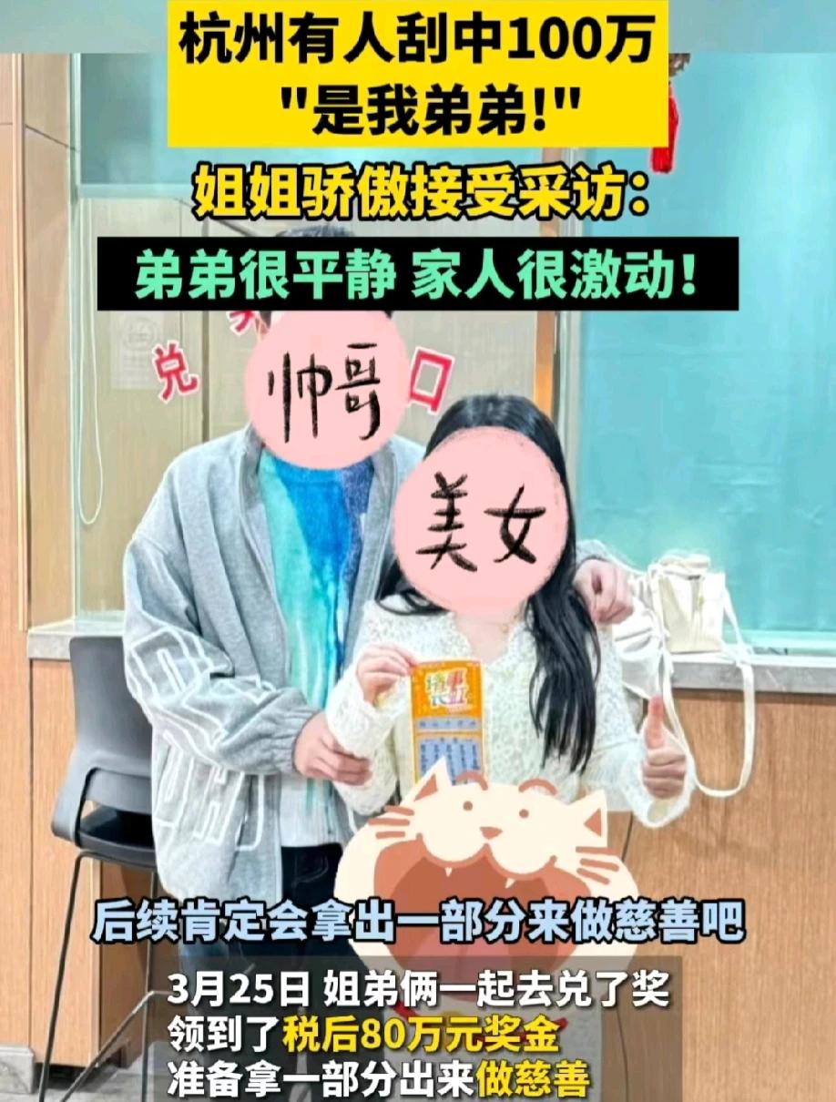 浙江杭州,一女子给了弟弟200元,弟弟拿着200元和同学去看电影。路过一彩票投注站,弟弟买了几张刮刮乐彩票,不料竟然中了100万大奖。当弟弟打电话给女子时,女子很激动,反而弟弟很平静。弟弟和姐姐第二天就去彩票中心,领取了税后80万元的奖金。姐姐说,会拿出一部分用来做慈善。