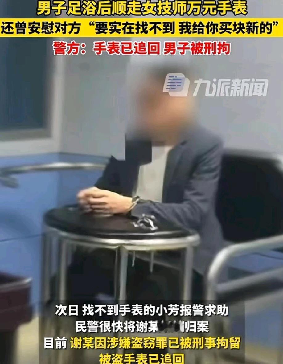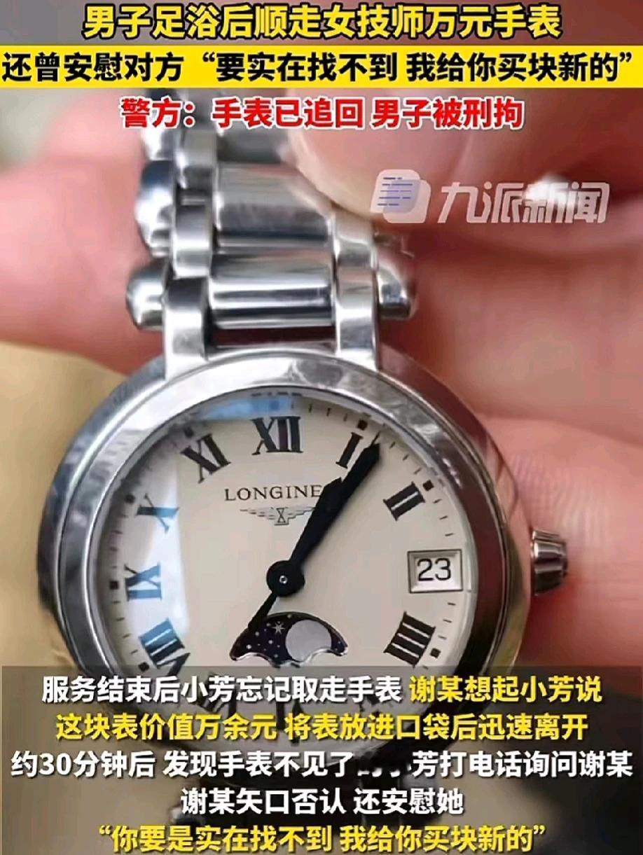 江西吉安,一男子去足浴店洗脚,看到女技师手上带有一块名贵的手表,一问价格,竟然要1万多元。男子动心了,在结账离开后顺手牵羊,将手表拿走了。女技师发现手表不见了,打电话询问男子,但男子却矢口否认。女技师报警。警方很快就将男子抓获。男子因为盗窃罪被刑事拘留。