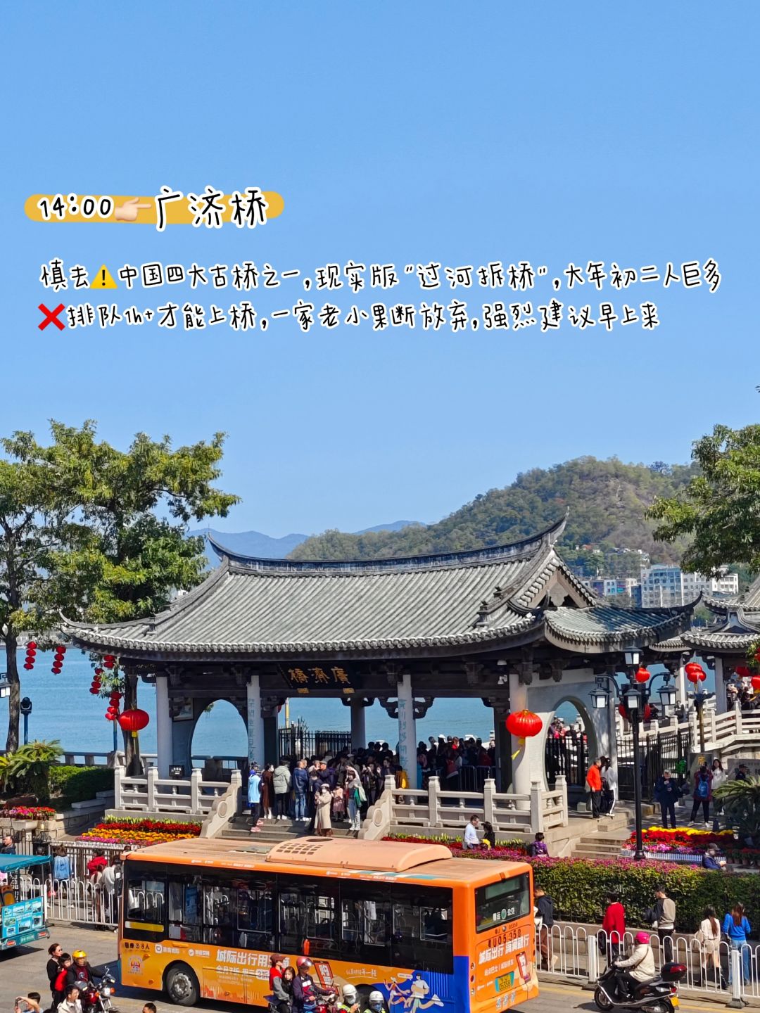 14:00👉🏻广济桥:慎去⚠️中国四大古桥之一,现实版“过河拆桥”,大年初二人巨多,❌排队1h+才能上桥,一家老小果断放弃,强烈建议早上来