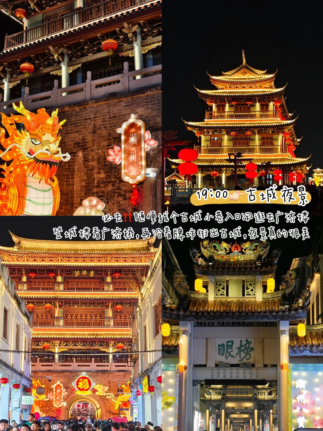 19:00👉🏻古城夜景:必去‼️随便找个古城小巷入口闲逛去广济楼,登城楼看广济桥,再沿着牌坊街出古城,夜景真的美