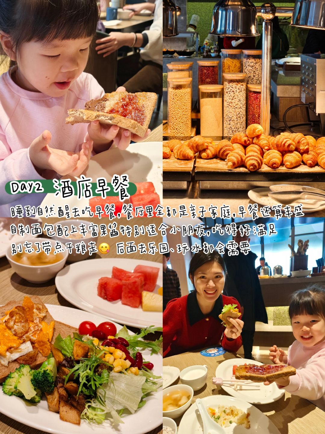 🔸酒店早餐:睡到自然醒去吃早餐,餐厅里全部都是亲子家庭,早餐还算丰盛,自制面包配上丰富果酱适合小朋友,吃完别忘了带点干粮走😋乐园玩水都需要