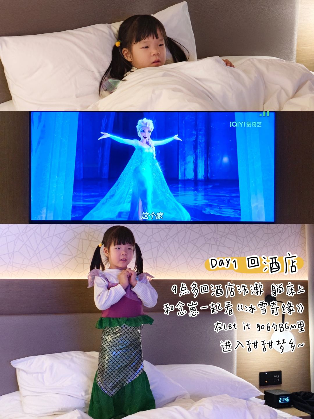 🔸回酒店:9点多回酒店洗漱,躺床上和念崽一起看《冰雪奇缘》,在Let it go的BGM里进入甜甜梦乡