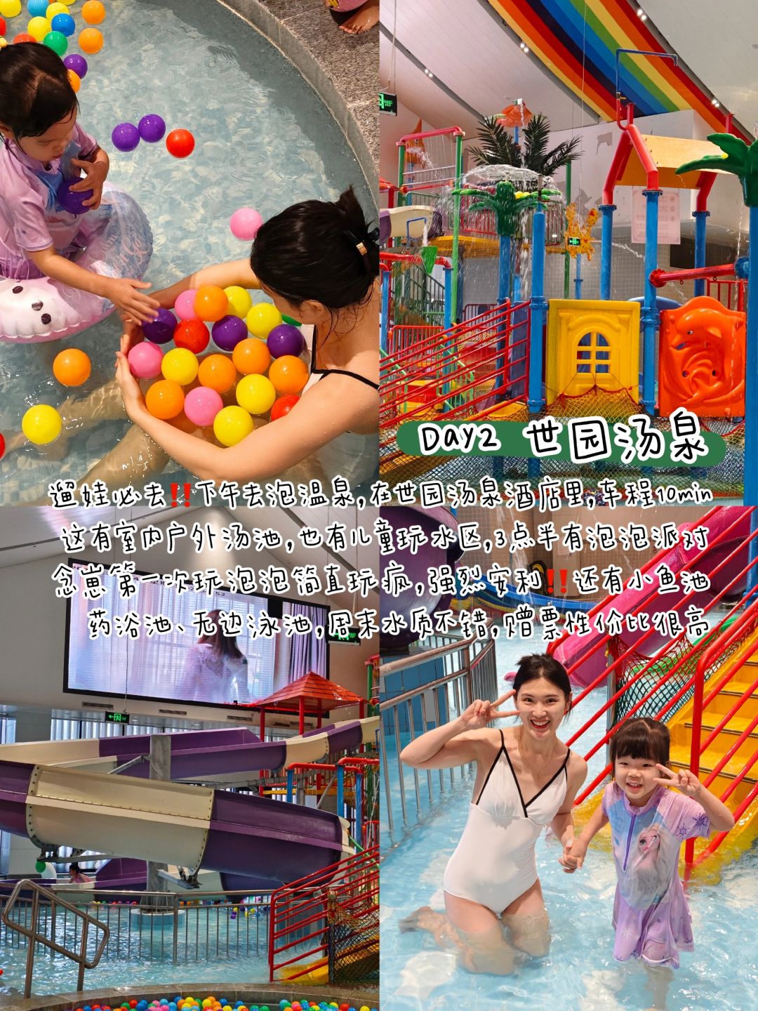 🔸世园汤泉:遛娃必去‼️在汤泉酒店,车程10min,有室内户外汤池,也有儿童玩水区,3点半的泡泡派对,念崽简直玩疯,强烈安利‼️还有小鱼池药浴池,水质不错
