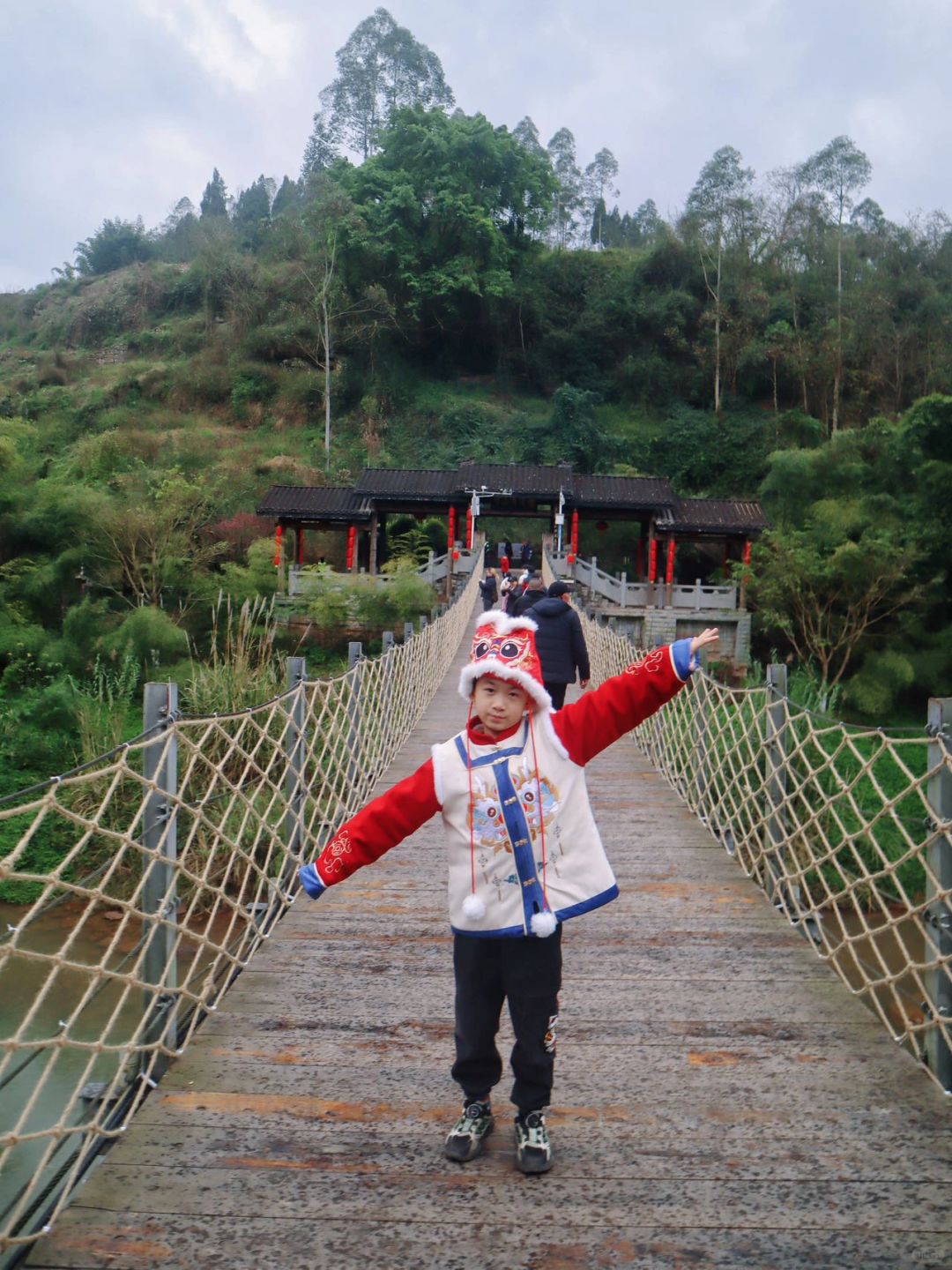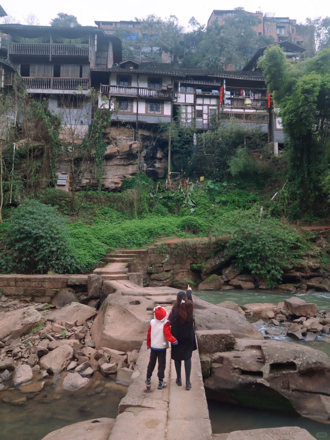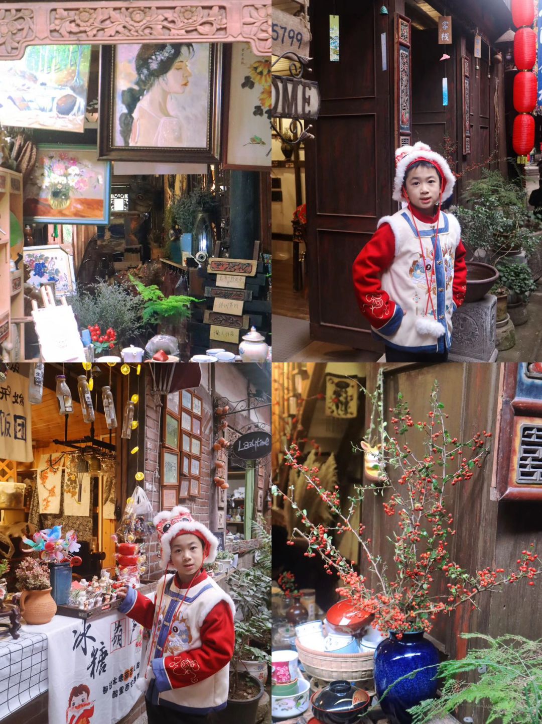 🌟🌟吃完饭带着小朋友漫游古镇,走在青石板小路上,看着两旁的特色吊脚楼,还挂着一串串红红的小灯笼🏮,新年氛围💯,打卡拍照jujuju出片,途中还遇到了漂亮的汉服姐姐表演舞蹈、弄茶,小盆友还踊跃参加了猜灯迷的活动……..