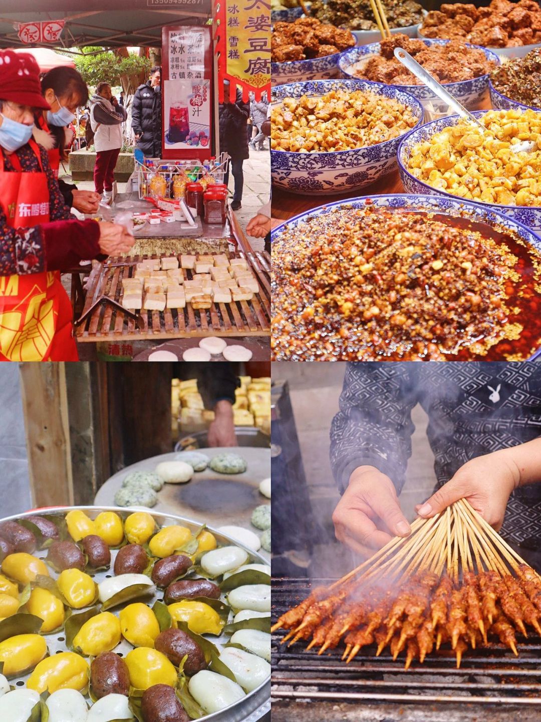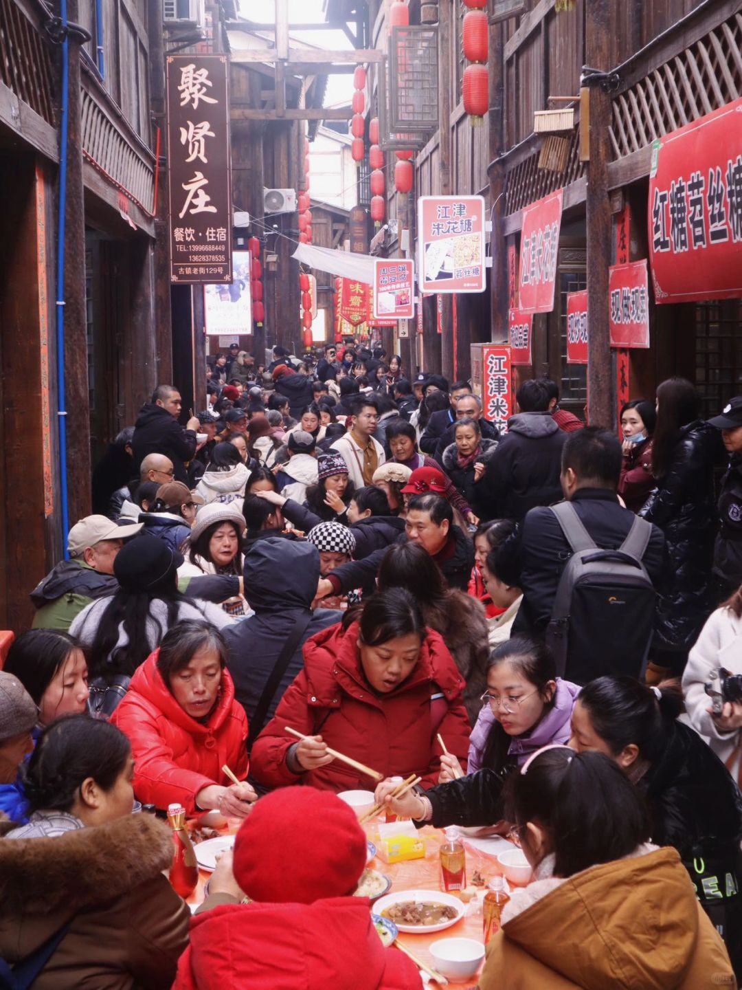 古镇里的千人宴就摆在餐馆的店门口,三五成群的人群落座后,真是座无虚席!🍲每个大圆桌子上都有一份精致的菜肴,有重庆特色的烧白、香肠、腊肉、还有各种小吃甜品等等,真是琳琅满目!看的人食欲大开!
