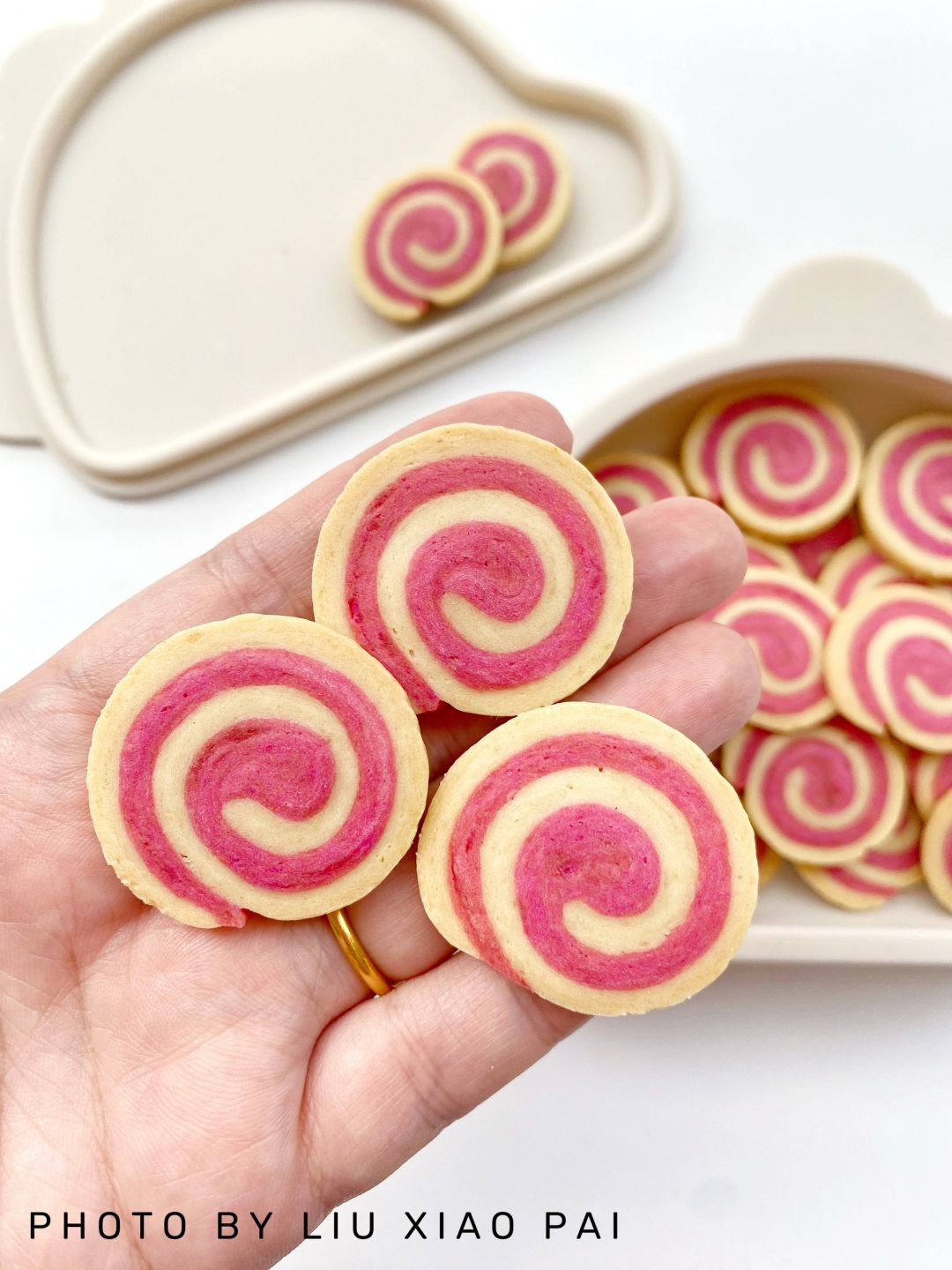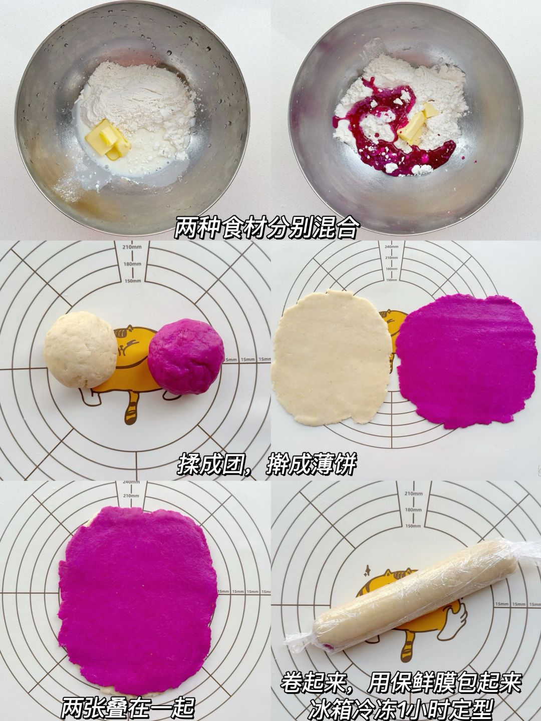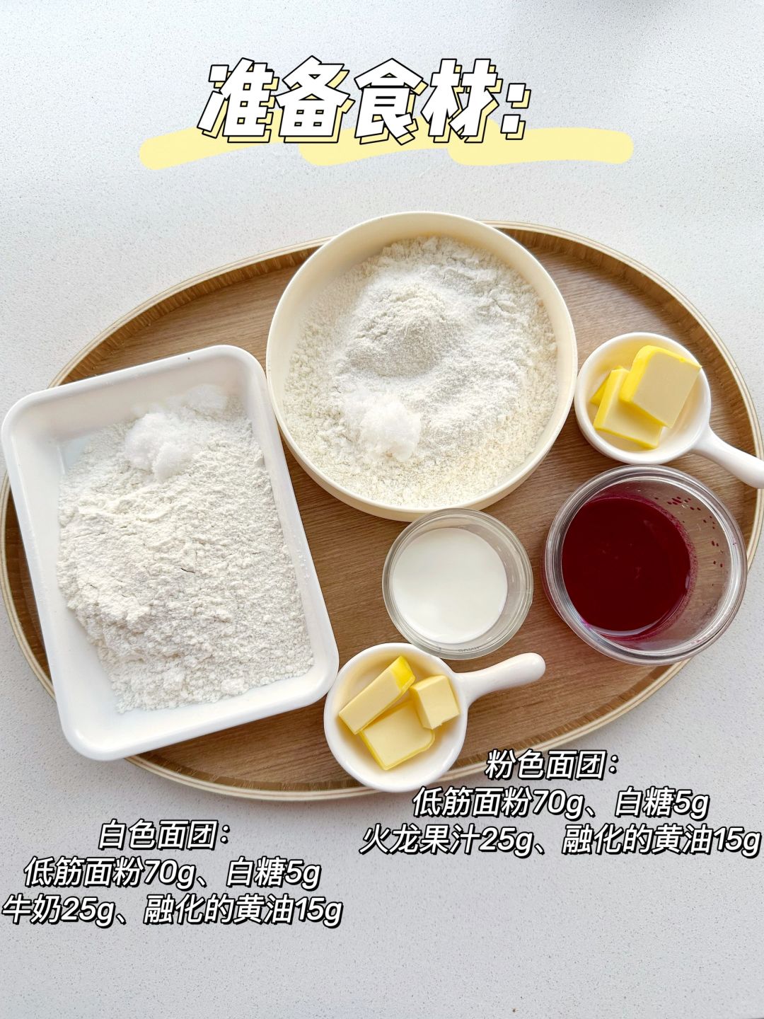💗粉色面团:低筋面粉70g、火龙果汁25g、糖粉5g、软化的黄油15g