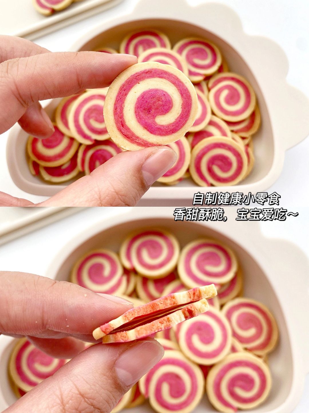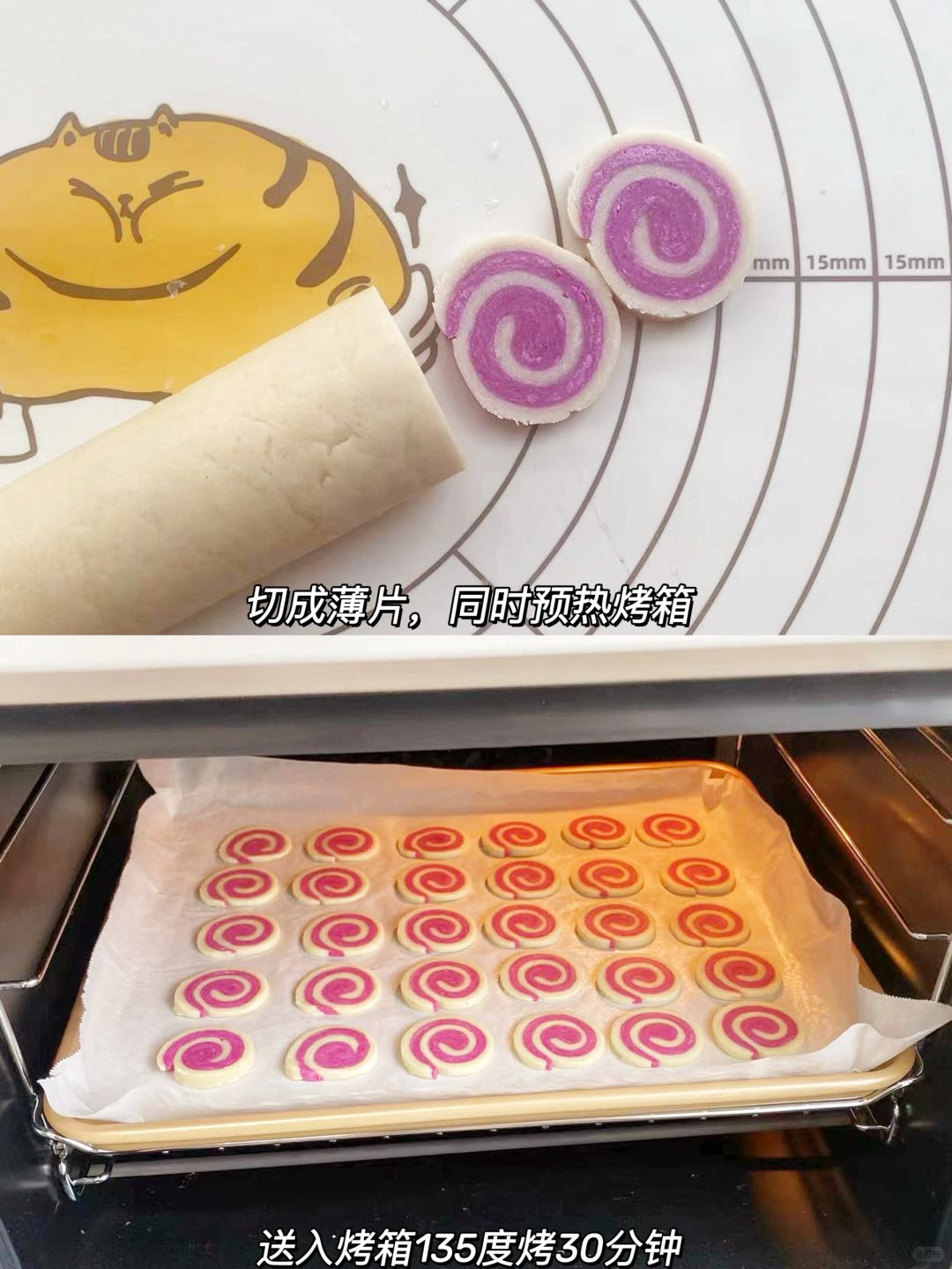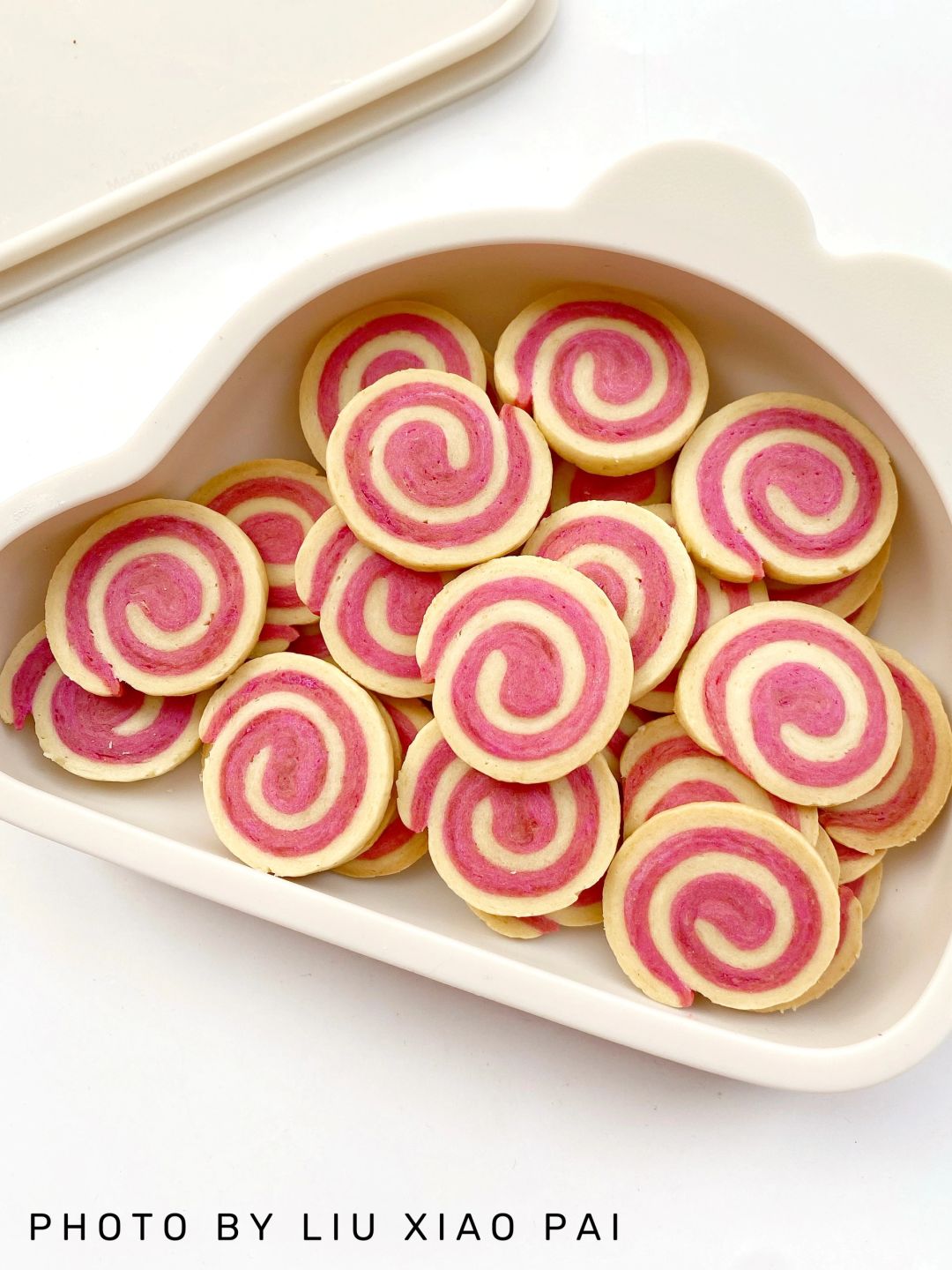 💗粉色面团:低筋面粉70g、火龙果汁25g、糖粉5g、软化的黄油15g