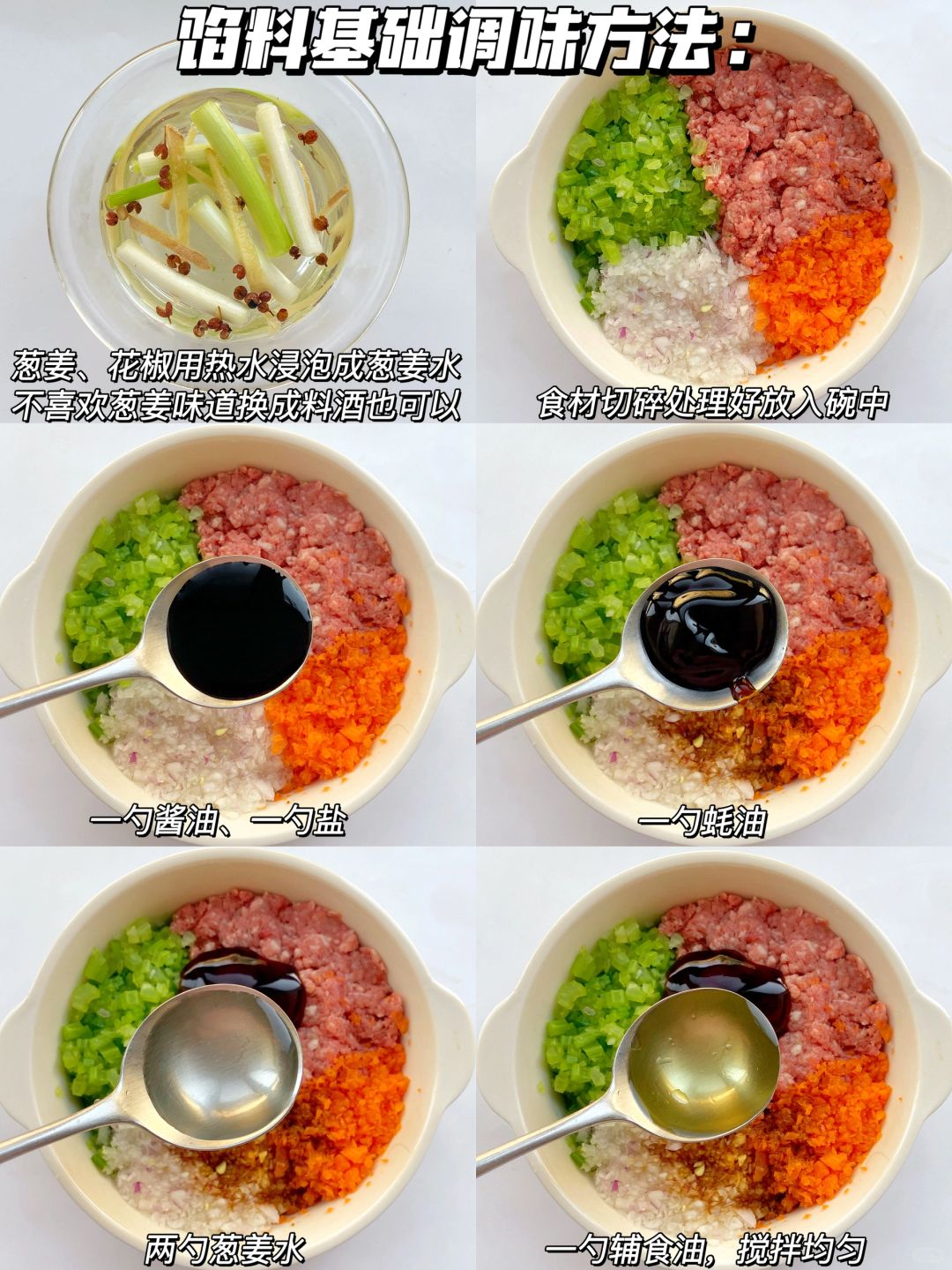 ➡️大人版葱姜水:葱+姜+花椒十大料+热水浸泡,其余调味料参考图片,可以根据口味增减。葱姜水分2次添加 每次少量,放多馅料会稀,不好包。
