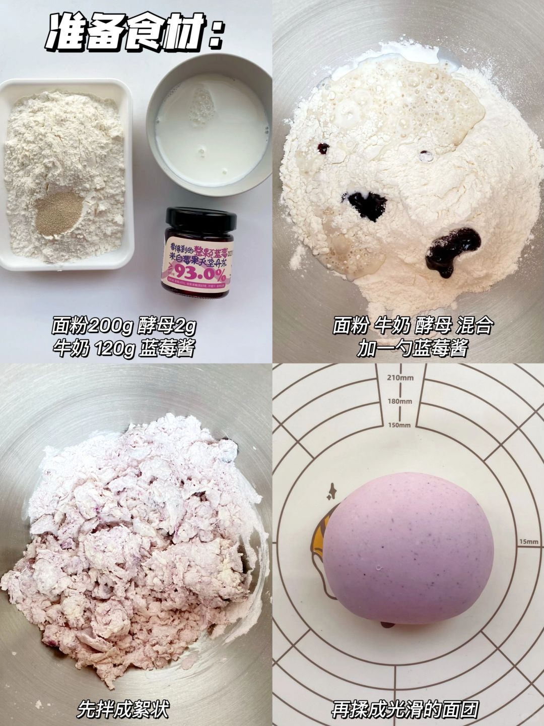 1️⃣面粉中加入酵母、牛奶和一勺蓝莓酱搅拌均匀,先搅拌成絮状,再揉成光滑的面团。如果揉不光滑可以先静置一会儿再揉,就容易揉光滑了。