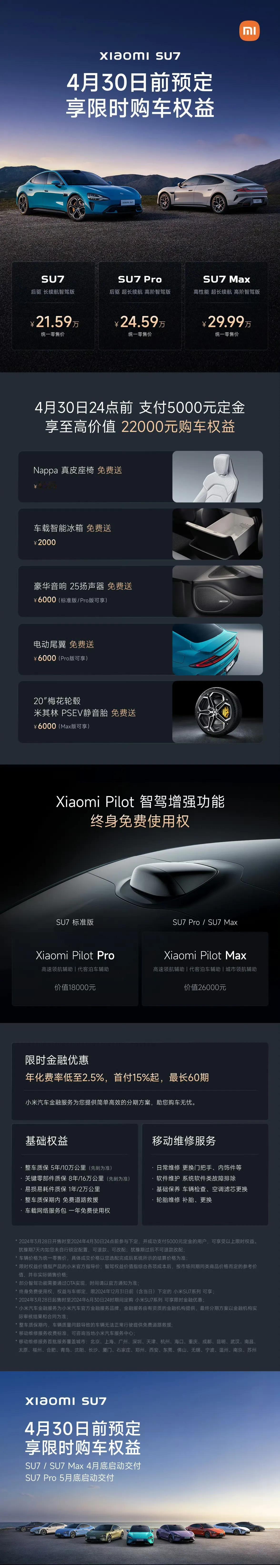 去年以来买车的人估计肠子都悔青了,小米SU7定价二十来万真是没想到。 知道价格的人无不想买一辆吧,小米汽车SU7以其出人意料的定价和强大的配置,成功打破了市场的平静。全系定价20多万起,没有30万,这一价格策略让所有人都大跌眼镜,雷军再次展现“价格屠夫”的风格。 在配置方面,小米SU7可谓诚意满满。全系标配骁龙8295智能座舱芯片、16.1英寸中控屏+7.1英寸翻转屏、电动后尾门以及全包围防晒隔热玻璃等豪华配置。不同版本在性能上也有所区分,标准版零百加速5.28s,定价21.59万;Pro版零百加速5.7s,定价24.59万;而Max版零百加速更是达到了惊人的2.78s,定价也仅为29.99万。这样的配置和价格,足以让小米SU7在新能源汽车市场中占据一席之地,哪来的入场晚了的说法,这样实力足够,什么时候都不晚。 在配置基础上,小米SU7在智能化方面也走在了行业前列。全系标配智能辅助驾驶功能,支持高速领航、一键代客泊车和智能泊车辅助等功能。同时,小米车载IOT设备直接领先一个层次,可谓降维打击,人车家智能生态紧密联系,为用户带来了前所未有的智能化体验。 此外,小米SU7在细节方面也做得相当出色。超大天幕玻璃整车玻璃面积5.35㎡,双层镀银天幕玻璃和四门车窗的UV-IR涂层,有效隔离紫外线、红外线,保护乘客免受阳光伤害。而32处收纳位和25个扬声器的设计,更是让车内的空间利用和娱乐体验达到了新的高度。 小米SU7以其出色的性价比、强大的配置和领先的智能化水平,成功吸引了市场的关注。对于那些还在观望的消费者来说,小米SU7无疑是一个值得考虑的选择。而那些曾经质疑小米造车能力的人,现在也应该被打脸了。#小米SU7起售价21.59万#