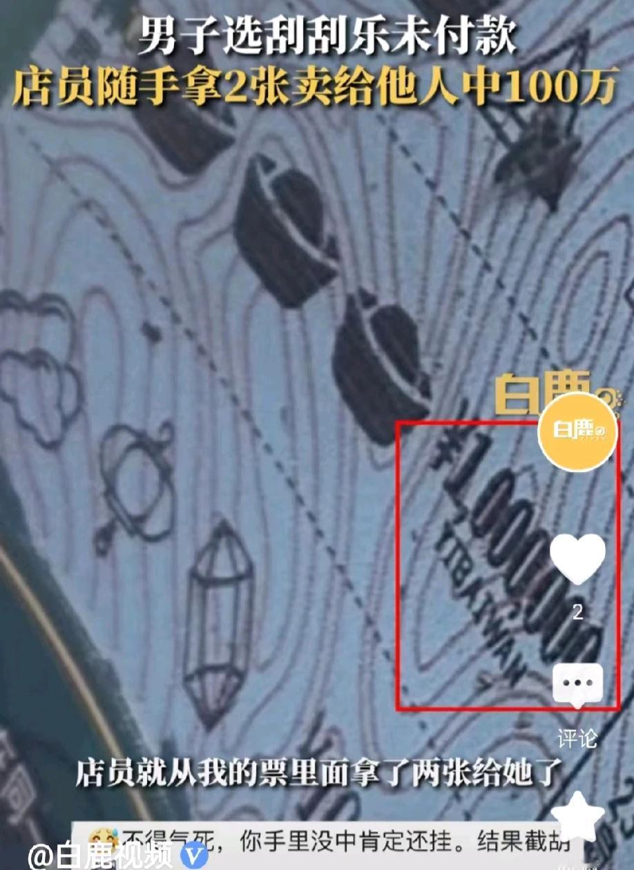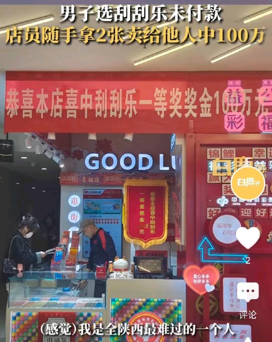 “100万就这样溜走了!”陕西西安,一男子来到彩票店购买刮刮乐,男子选了好几本刮刮乐彩票,但没有先付钱。男子对彩票店工作人员说,先刮,最后一起结账。此时走进来了一名女子,女子也要购买刮刮乐。彩票店工作人员从男子选中的一堆中抽出两张给女子。不料,女子却中到了100万大奖。男子无奈的表示,很后悔没有先付钱。