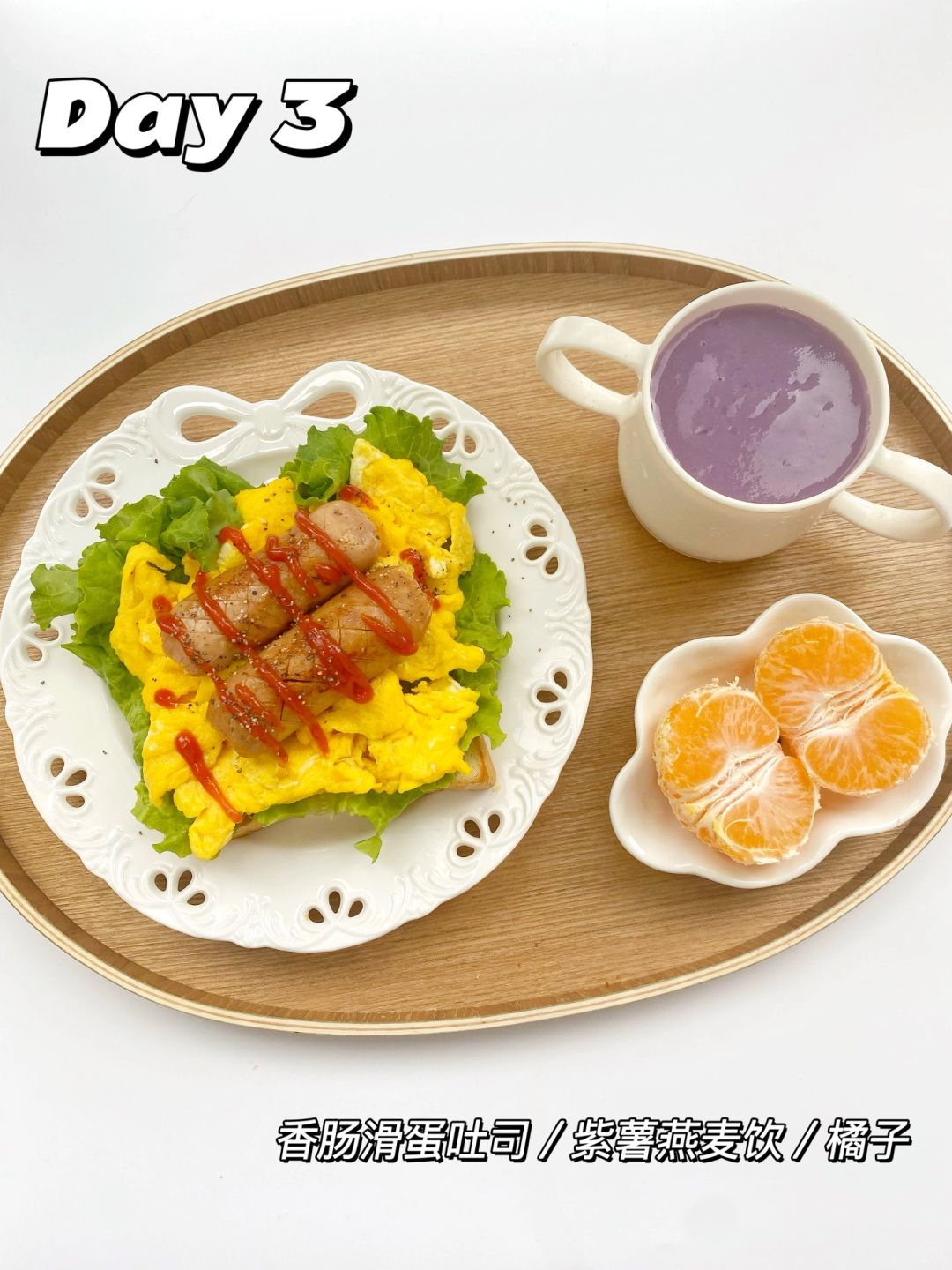 香肠滑蛋吐司+紫薯燕麦饮+橘子
