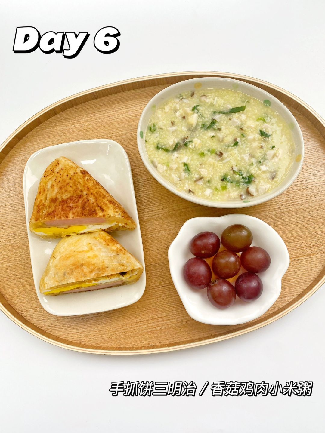🥪手抓饼三明治+香菇鸡肉小米粥+葡萄