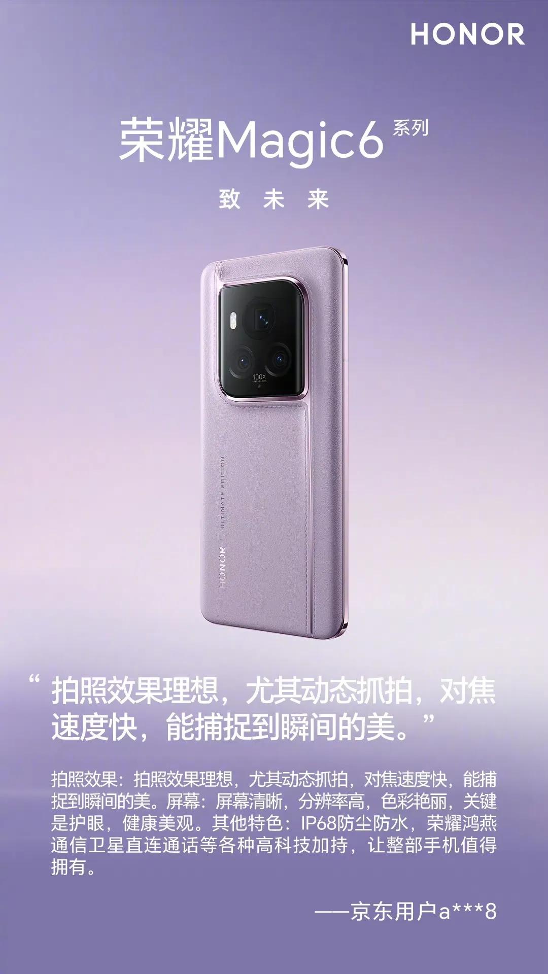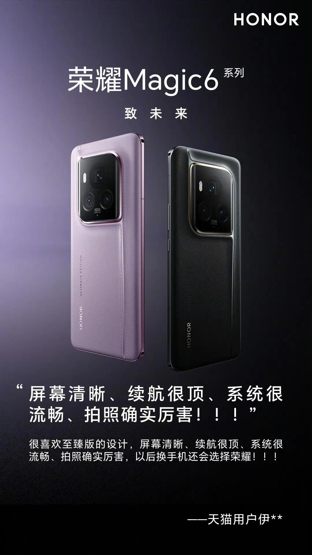 荣耀Magic6至臻版的首批消费者评价已经火热出炉啦! 消费者们纷纷称赞其外观新颖独特,高端智能设计让人爱不释手。荣耀金刚巨犀玻璃的运用,更是让消费者们告别了贴膜的烦恼。屏幕清晰明亮,续航表现也非常给力。此外,抓拍功能更是强大,指哪拍哪儿,拍照效果让人惊艳。 面对荣耀Magic6 Pro和至臻版的选择,真是让人纠结不已,究竟该入手哪款呢?