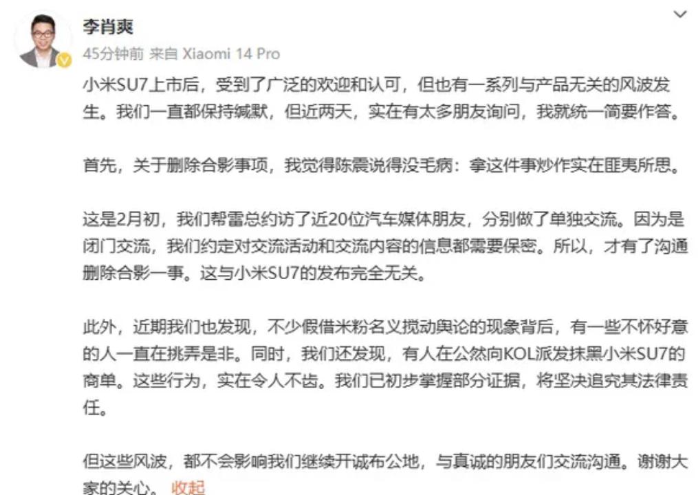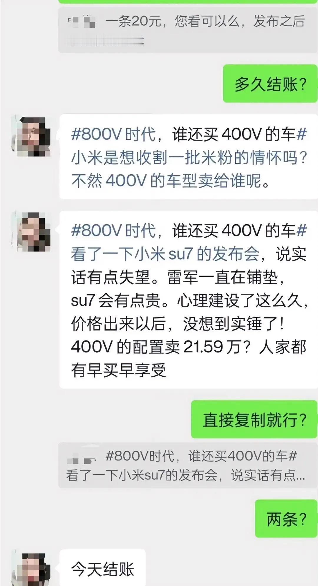 果然是有组织的行动,怪不得#罗永浩怒斥媒体黑小米汽车#。 小米SU7已经发布,热度一波接着一波,在大多数正面评价之外,还伴随着不少负面信息,现在还被曝光出有组织有酬劳的抹黑稿件。抹黑商单在当下还有市场吗?我认为往往会适得其反。首先,互联网是相当透明的,你发布的信息总有可能会被传播出去,况且还带有对比的黑稿,那不是自报家门吗? 大家可能觉得对比没问题,其实对比本身没问题,但是选择性对比那就是双重标准了,专挑有利于自己的去对比,那实际上就是抹黑。如果想做真的做对比,不如大大方方地全面对比,这样消费者也信服,自己也不会被抓住把柄。 同样颇具热度的还有陈震相关事件,不少人以米粉的身份挑唆陈震,那这些人到底是不是米粉?这恐怕要打一个问号。倒是李肖爽的微博尽显格局,没把陈震当外人,只不过陈震把私人对话放出来有点说不过去。 还有人在小米SU7发布后在抖音直播间和各个车圈大V评论区刷屏,这很难不让人思考到底是不是有组织的行动,正常人谁会到处刷屏啊,闲着没班上吗? 种种迹象表明汽车圈越发乌烟瘴气,毕竟小米热度太大了,而市场只有那么大,部分车企在正常竞争中已经显得不自信了。怪不得罗永浩会怒斥媒体抹黑小米汽车,这跟当年锤子手机被抹黑可能是相同的路数,罗永浩深受其害,感同身受。希望小米汽车不会像锤子手机那样的结局。