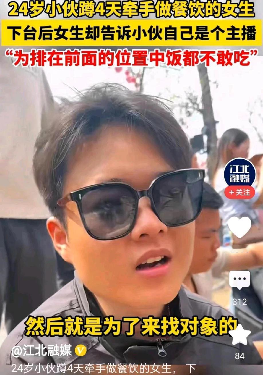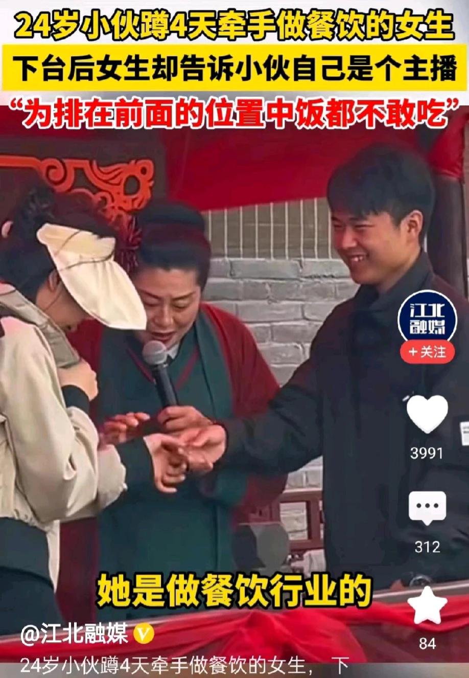 河南开封,一24岁小伙子为了找到对象,在“王婆说媒”相亲舞台,蹲守了四天,为了排在最前面的位置,小伙子中午连饭都不敢去吃。好不容易上了舞台,一名自称做餐饮的女子主动与小伙子牵手成功。小伙子没高兴多久,下台后女子就说自己是主播,不是来找对象的,而是来蹭流量的。小伙子彻底懵了,想不到为了流量,竟然可以这么无下限呀!