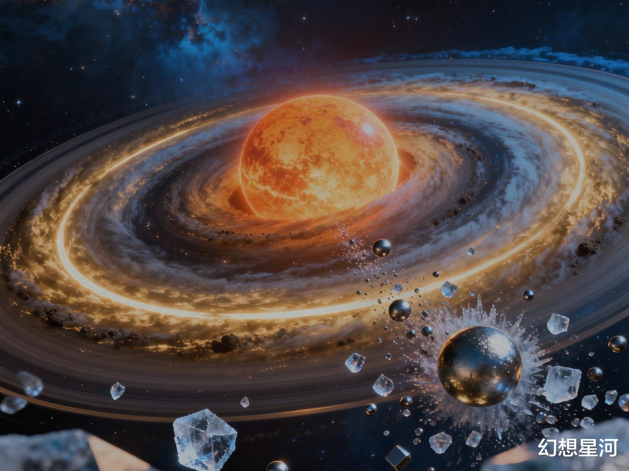 太阳系诞生前,一团冰冷的分子云,在太空里飘着。约四十五亿年前一颗超新星的冲击波,让云团开始收缩,太阳在中心形成,外围的尘埃、冰粒和金属颗粒,在旋转中不断碰撞。毫米级的小碎块,由微小的微米级颗粒慢慢聚成,公里级的微行星,再由这些小碎块进一步凝结,引力和静电,让它们越抱越紧,直径上百公里的原行星,就此慢慢长成。