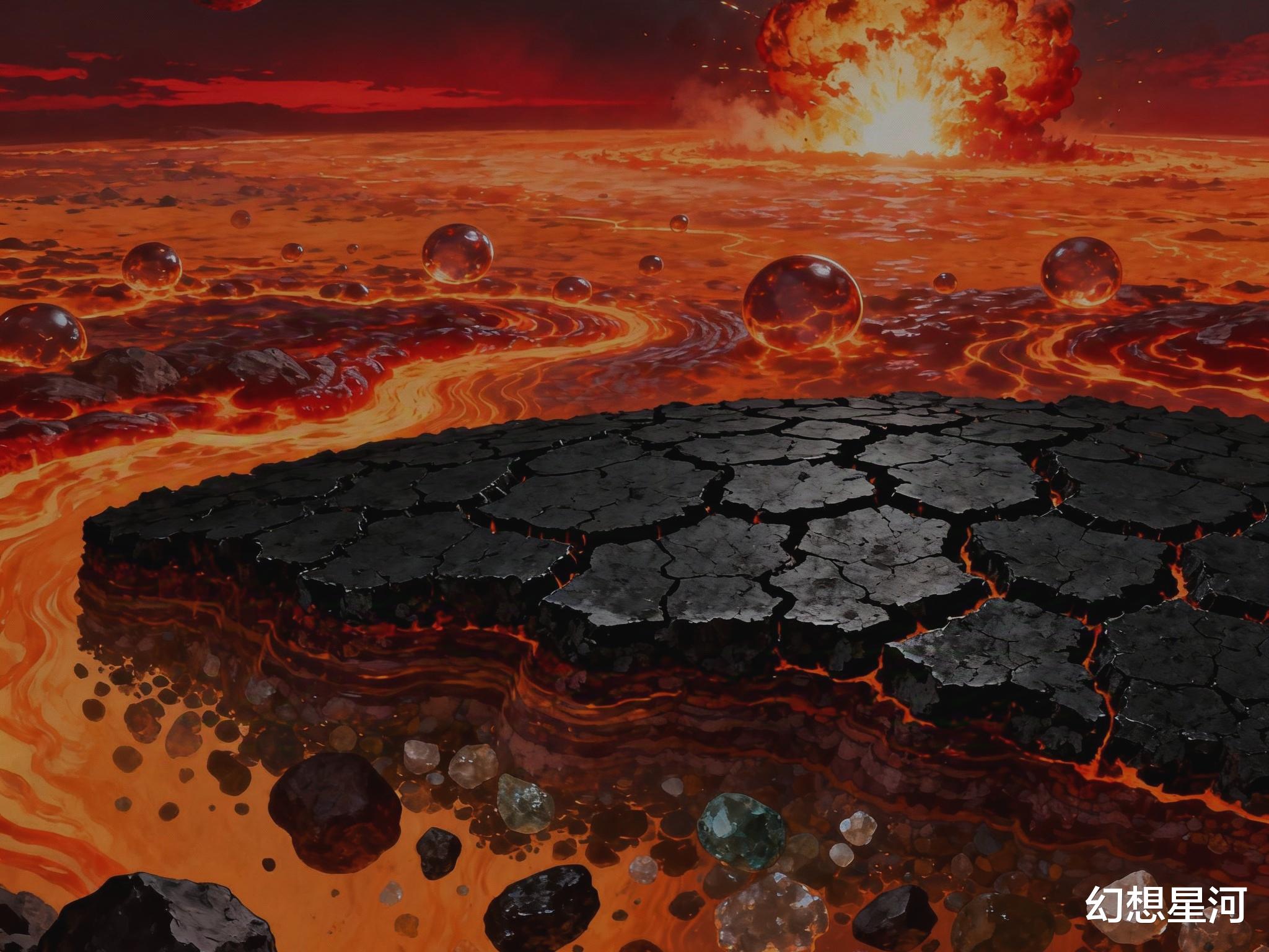 新生的地球,一点都不温和,放射性元素和引力势能让它变成了一片火海。微行星不断撞击地表,温度飙升到两千度以上,整个星球,被数百公里深的岩浆海覆盖。重的元素往下沉,轻的矿物往上浮,最表层的玄武质熔岩,先完成了冷却,结成了一层黑乎乎的初生地壳,这是地球上最早的岩石圈。它薄得像蛋壳,却在后来四十亿年里被板块运动反复回收、改造,现在只能在加拿大北部、格陵兰岛这些偏远地方,找到几厘米宽的阿卡斯塔片麻岩残片,那是时间留下的稀少痕迹。