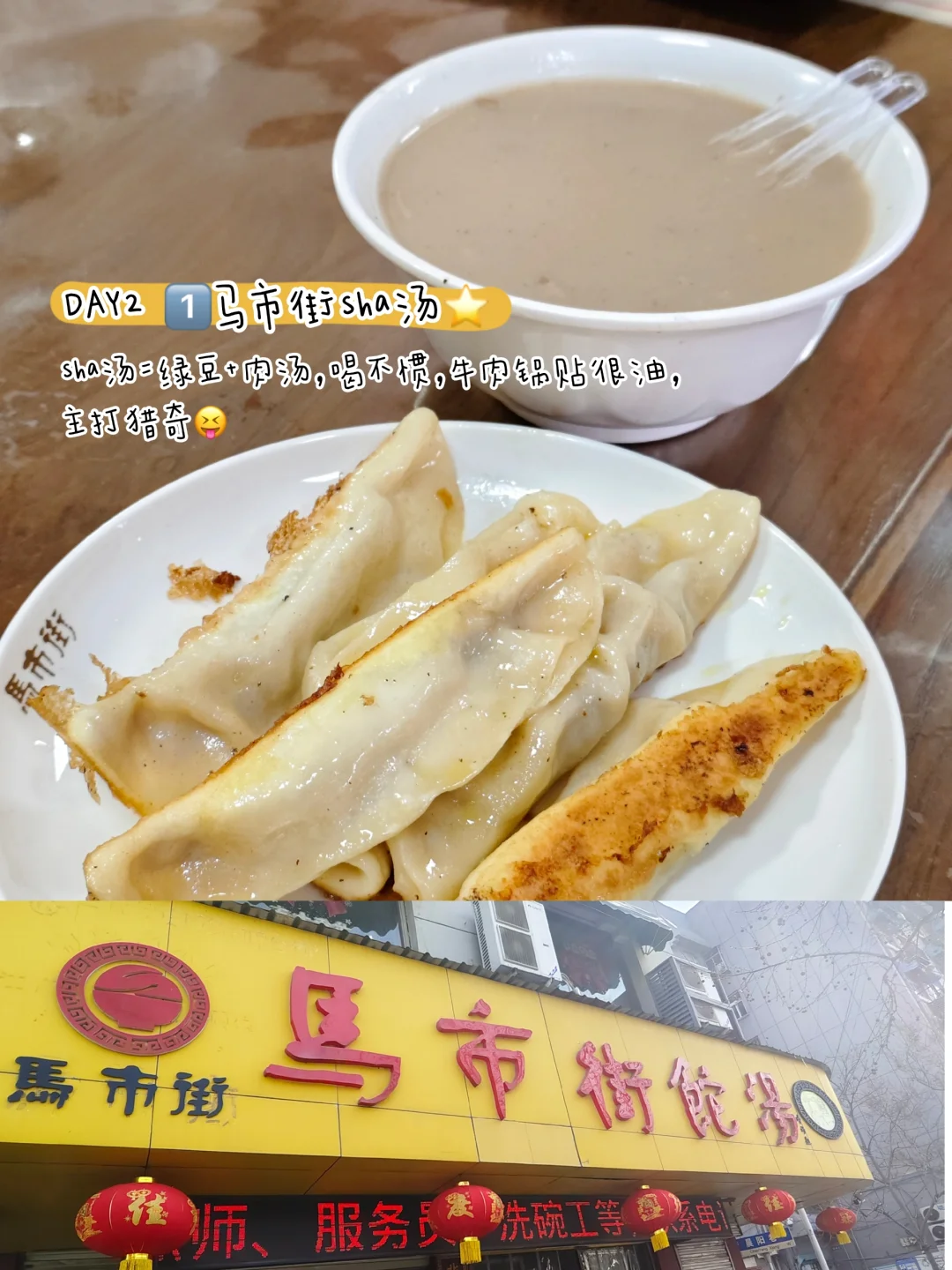 1⃣️马市街sha汤⭐:sha汤=绿豆+肉汤,喝不惯,牛肉锅贴很油,主打猎奇😝