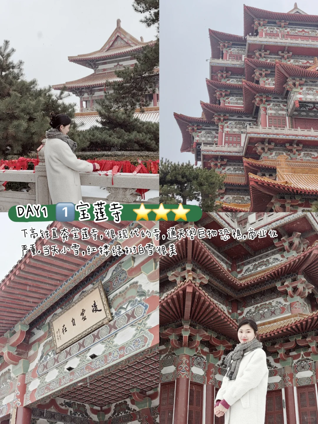 下高铁直奔宝莲寺,很现代的寺,通天阁巨物恐惧,商业化严重。当天小雪,红楼绿树白雪很美