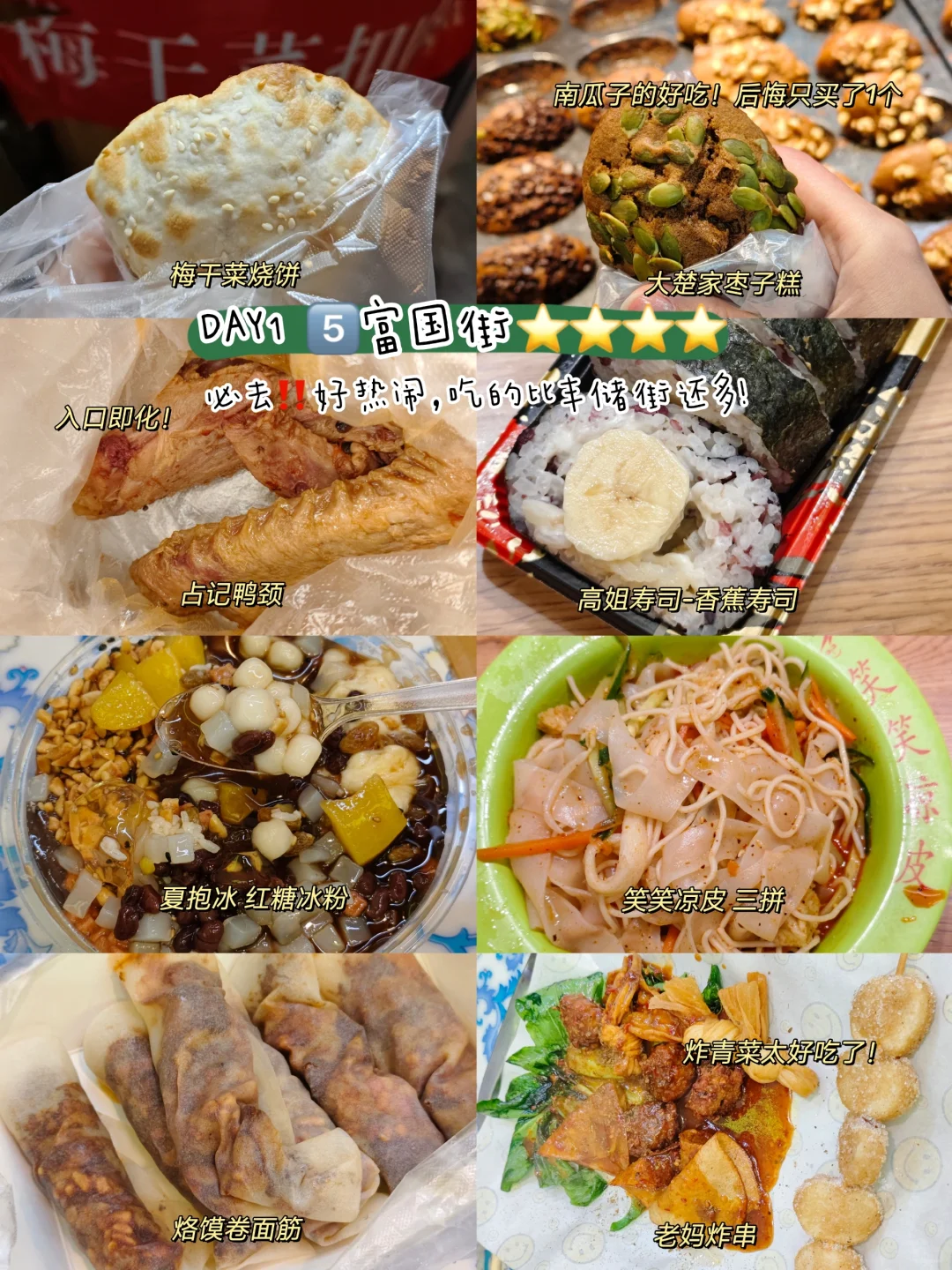 👍🏻好吃的:占记鸭颈(入口即化)、大楚家枣子糕(南瓜子枣糕绝了)、高姐寿司(香蕉寿司爱了)