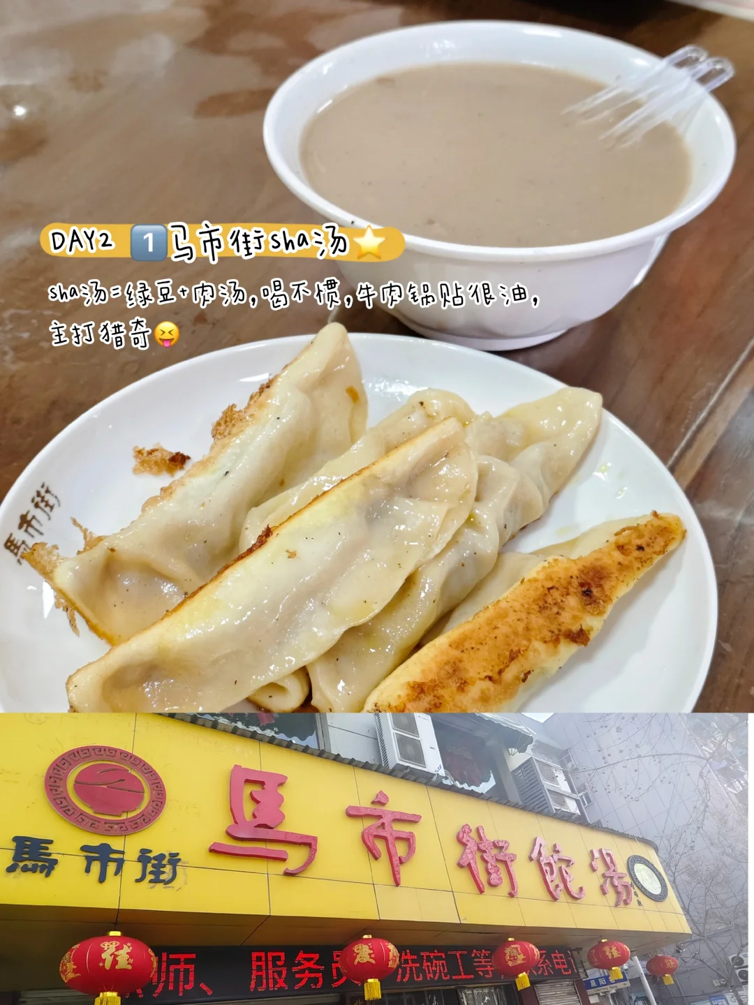 1⃣️马市街sha汤⭐:sha汤=绿豆+肉汤,喝不惯,牛肉锅贴很油,主打猎奇