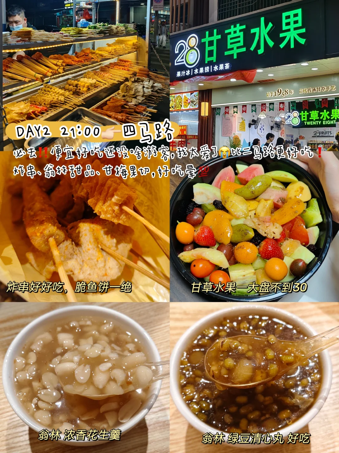 4⃣️21:00👉🏻四马路:必去‼️便宜好吃还没啥游客,我太爱了😭比二马路更好吃❗炸串、翁林甜品、甘梅果切,好吃晕💯