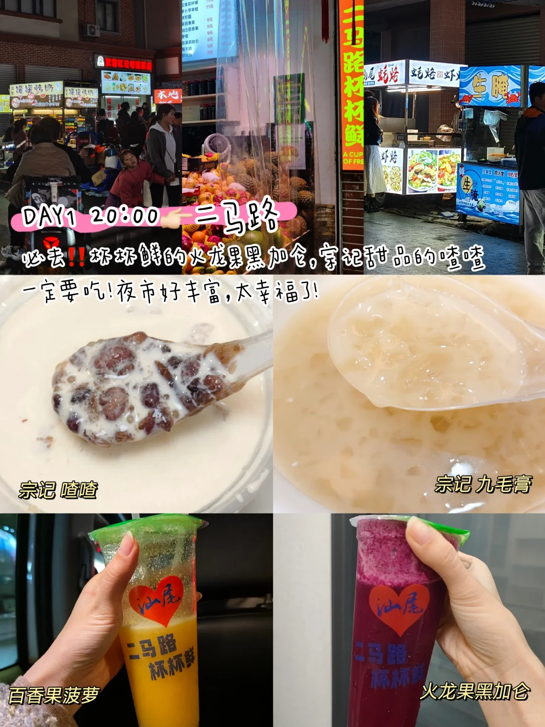 5⃣️20:00👉🏻二马路:必去‼️杯杯鲜的火龙果黑加仑,宗记甜品的喳喳,一定要吃!