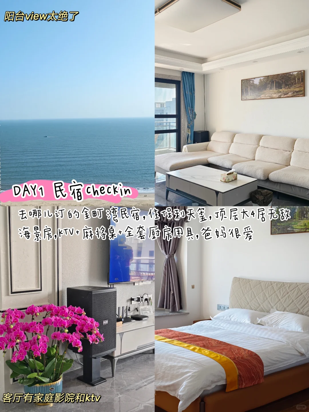 🏨住宿:🐫订的金町湾民宿,住保利天玺,顶层大4居无敌海景房,KTV+麻将桌+全套厨房用具,爸妈很爱